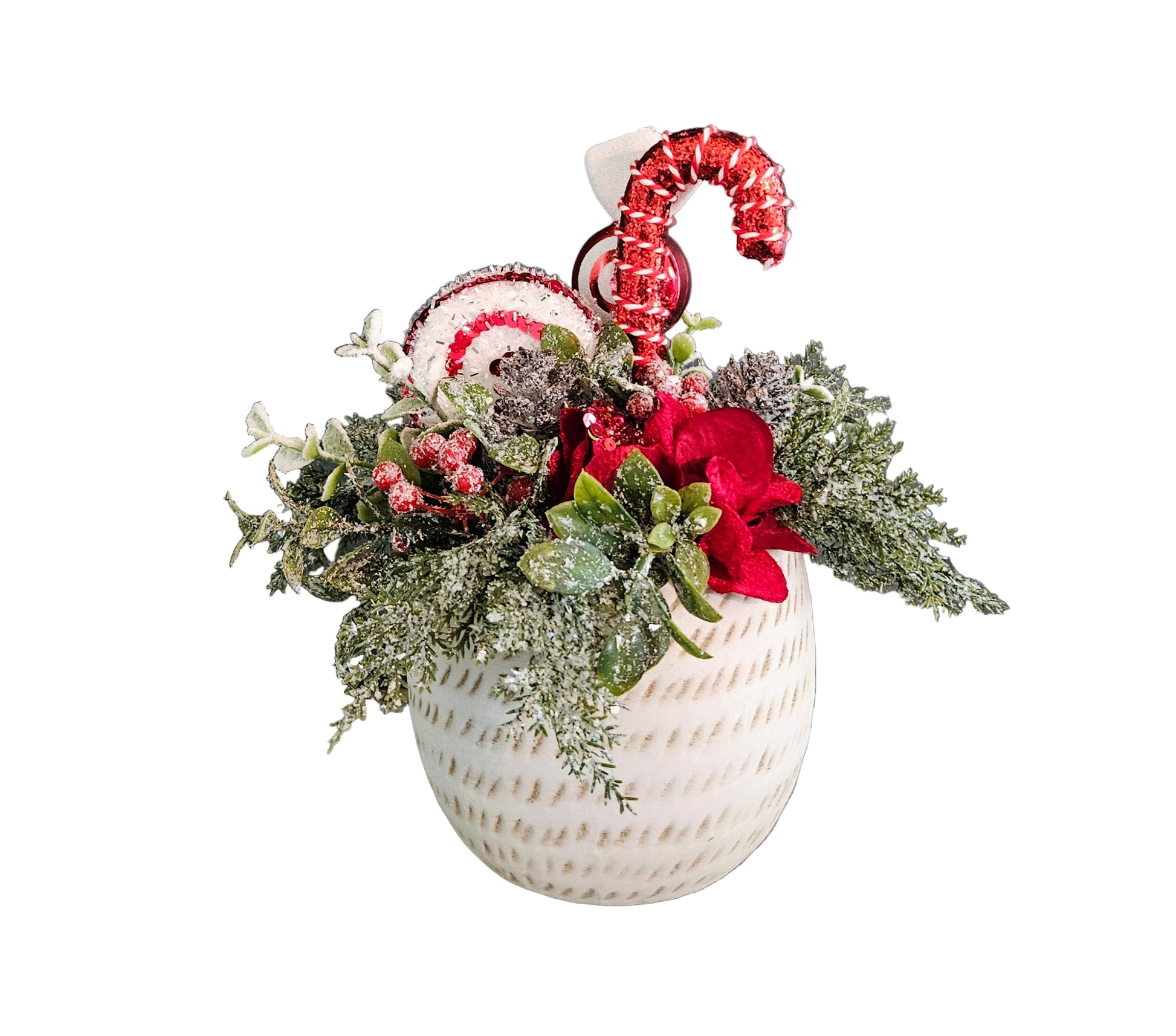 This 8" tall filler holiday arrangement is designed in a ceramic container with frosted greenery, hydrangeas and decorative assorted candy.
