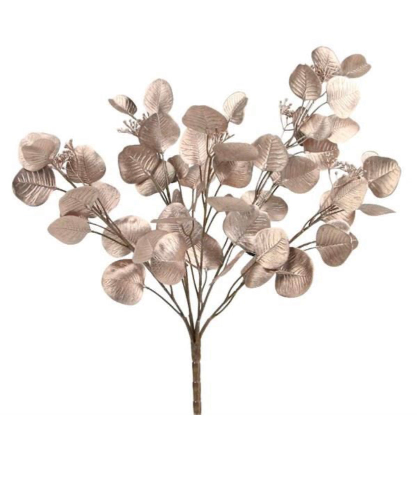 Enhance your space with this stunning 19" Eucalyptus Bush in a luxurious rose gold hue. Perfect for adding a touch of elegance and sophistication to any room, this lifelike artificial plant is an effortless way to bring the beauty of nature indoors. Whether displayed on its own or incorporated into a floral arrangement, this eucalyptus bush is sure to elevate your decor.