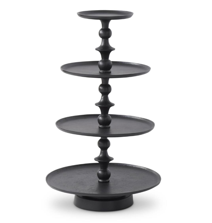 Introducing the Black 4-Tiered Graduated Stand. Made of durable black material, this stand features four levels of spacious trays. Perfect for organizing and displaying various items. Increase efficiency and elegance with this essential storage solution.