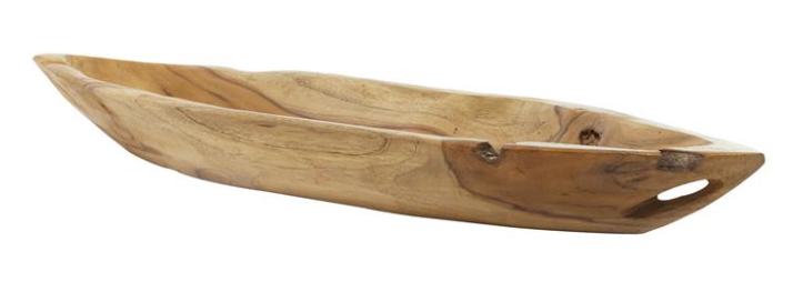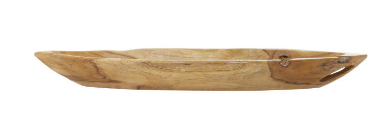 The brown teak wood tray measures 28L x 6W x 5H inches.