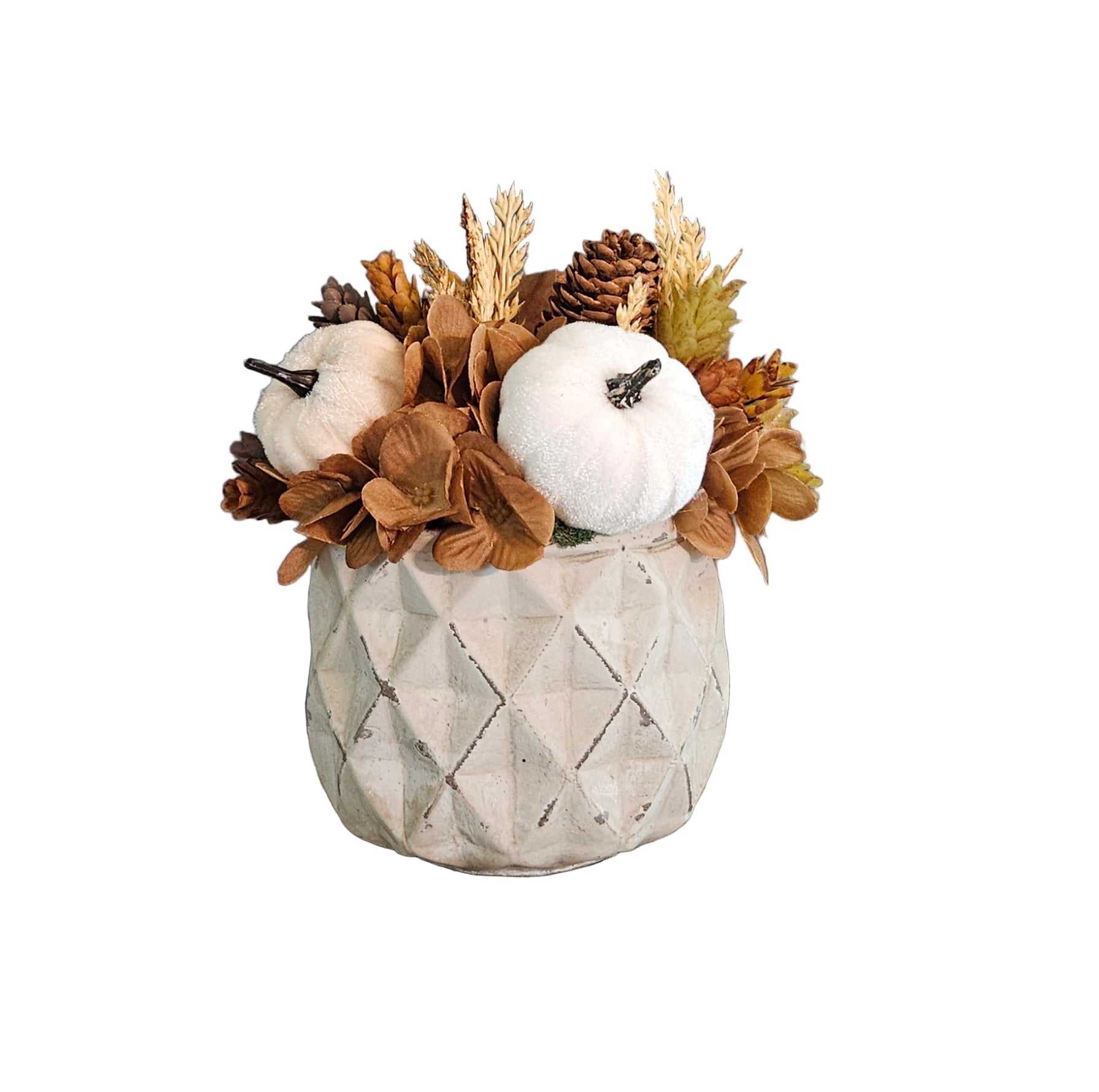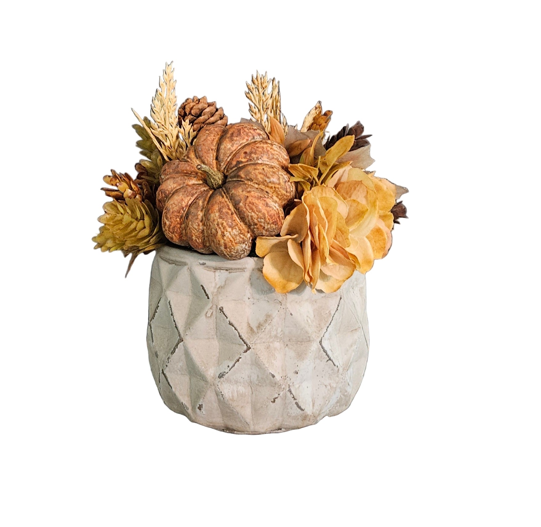This 8" tall filler arrangement is designed in a cement container with faux pumpkins and hydrangeas.