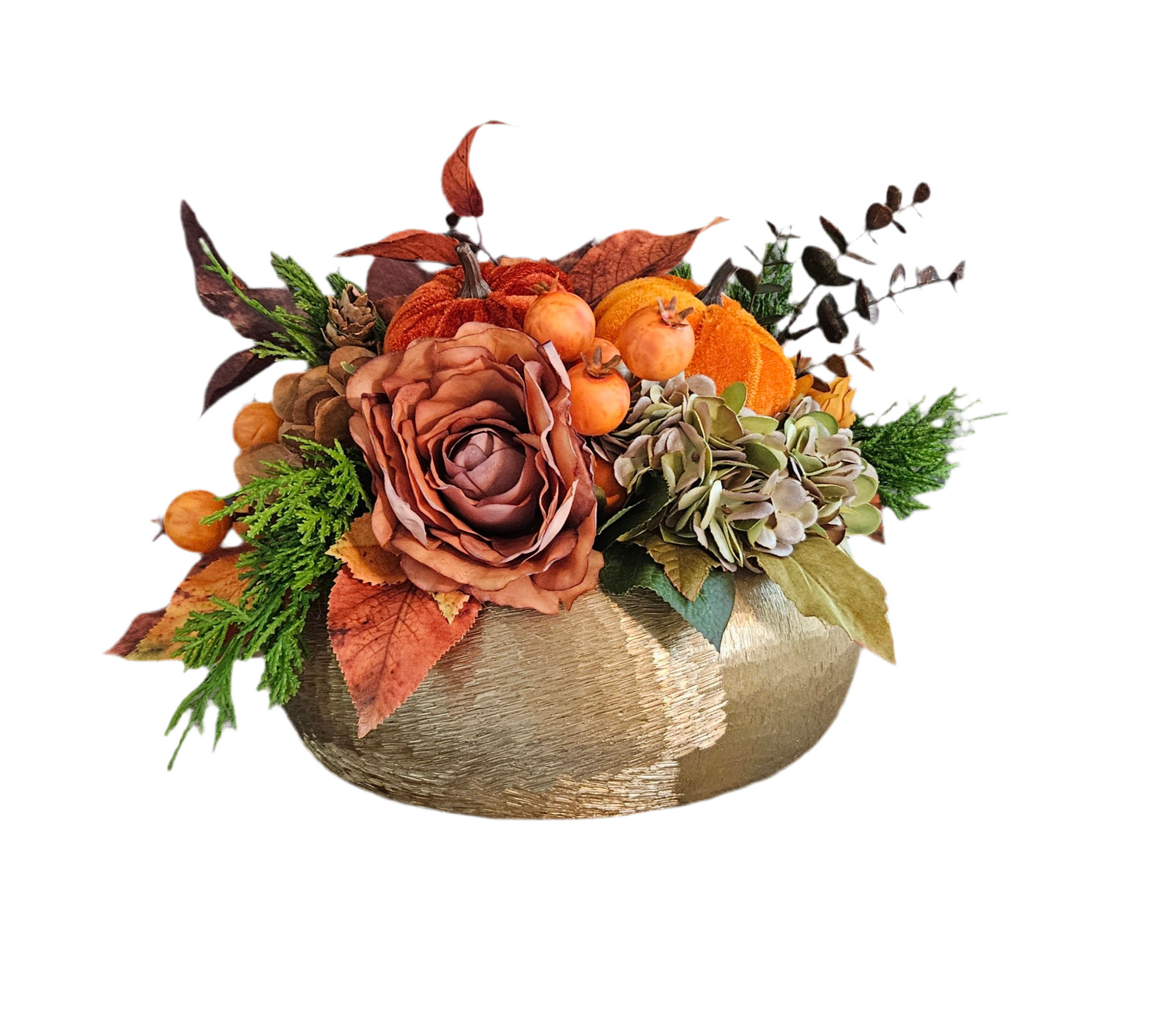 This arrangement is designed with assorted dried look roses, fall foliage and velvet pumpkins.