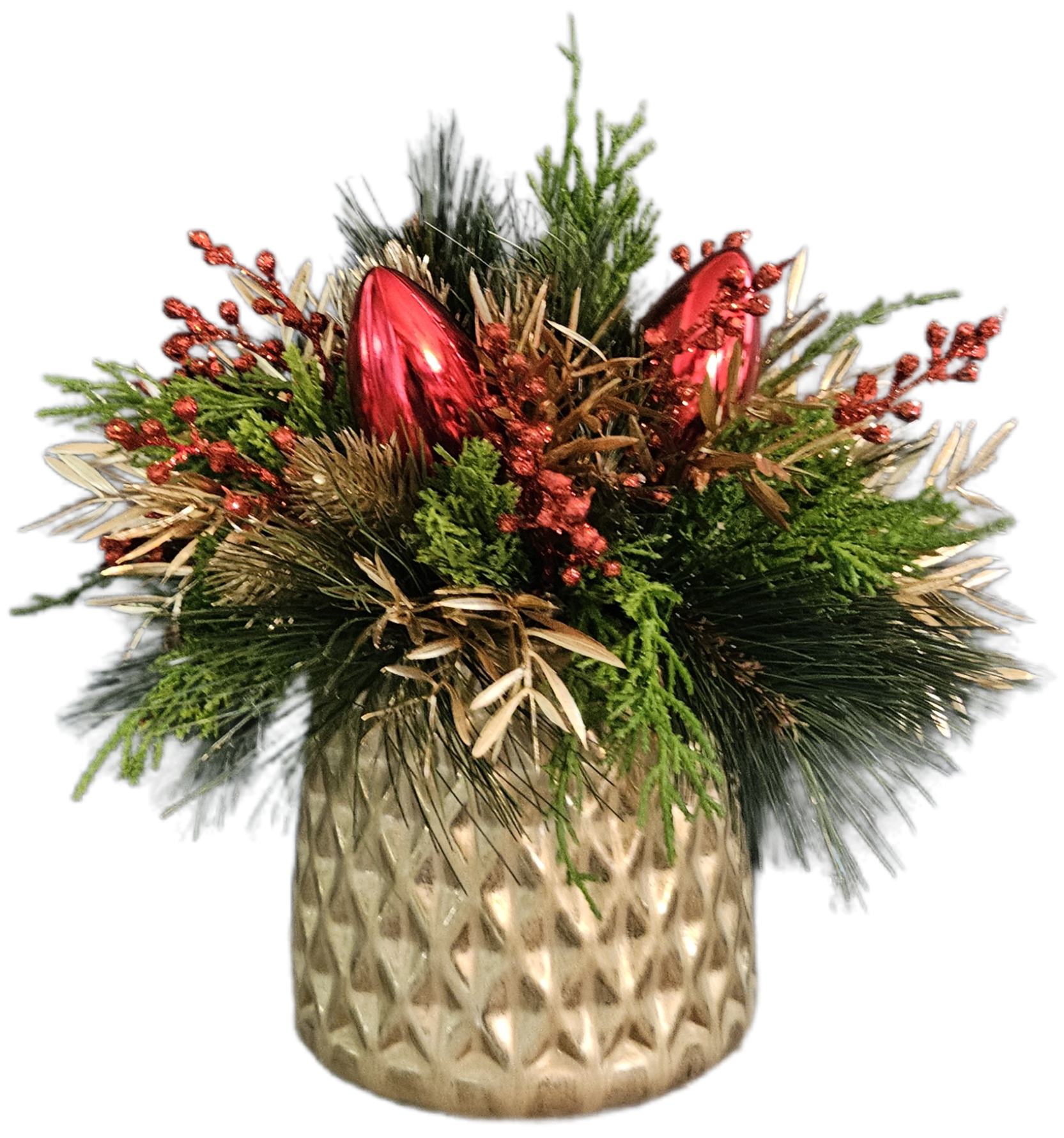 This traditional Christmas arrangement is designed with assorted pine, red Christmas bulbs and gold filler.