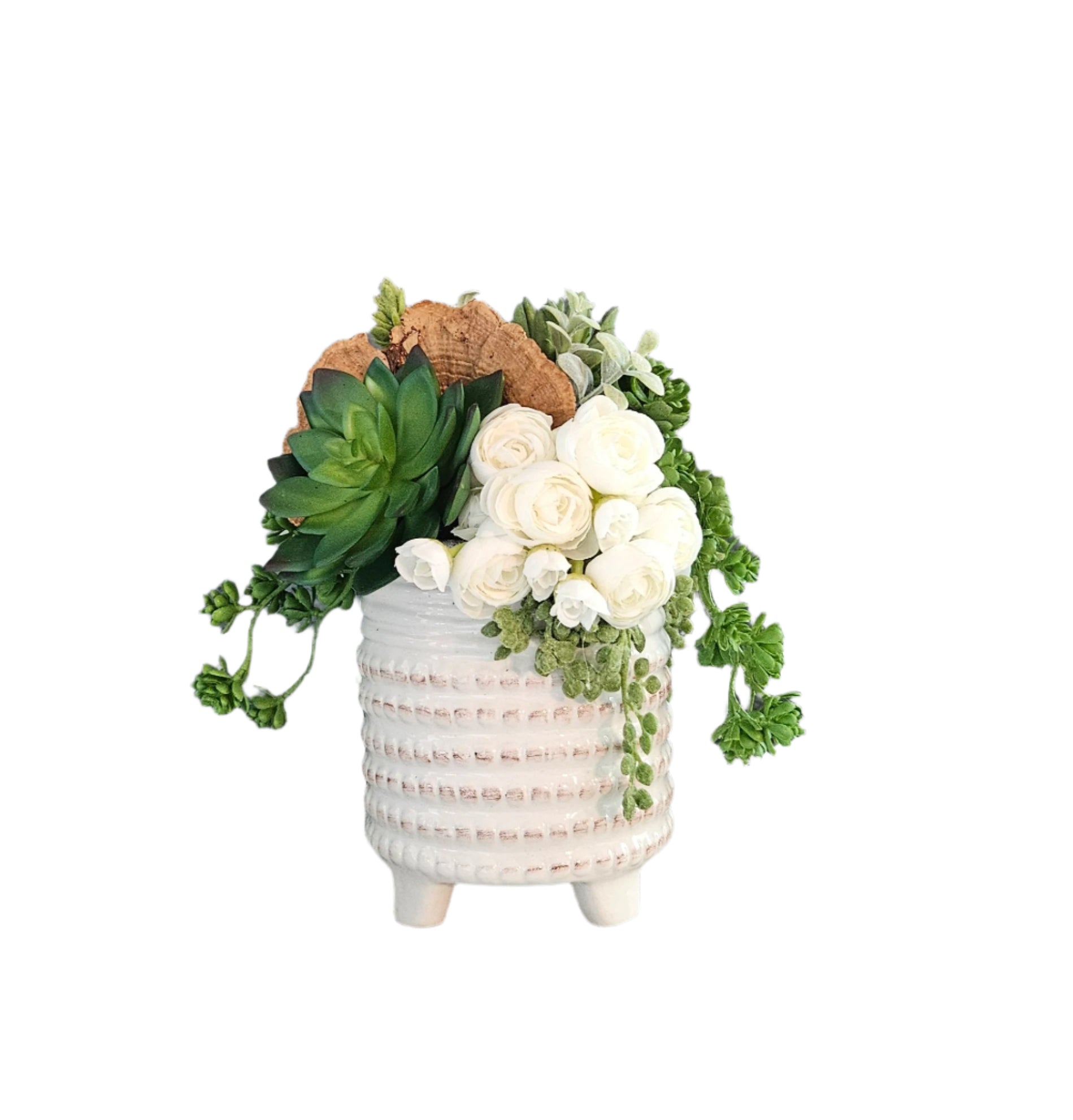 This arrangement is designed with white ranunculus, succulent and eucalyptus.