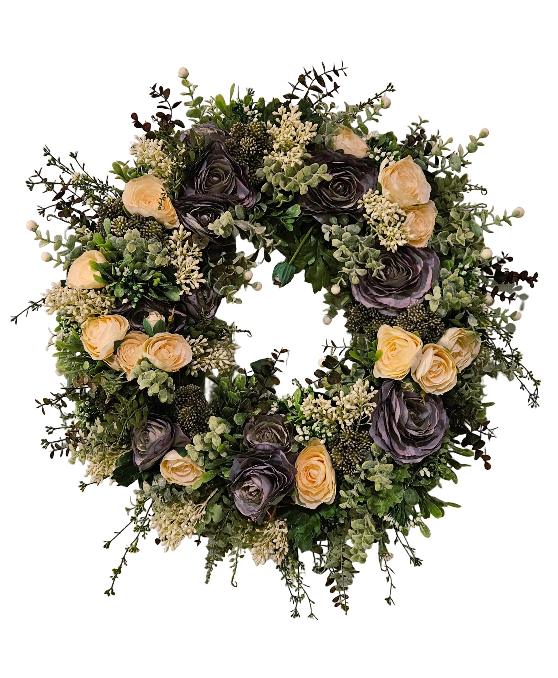 This 24" wreath is designed with silk ranunculus,  assorted greenery and berry blooms.
