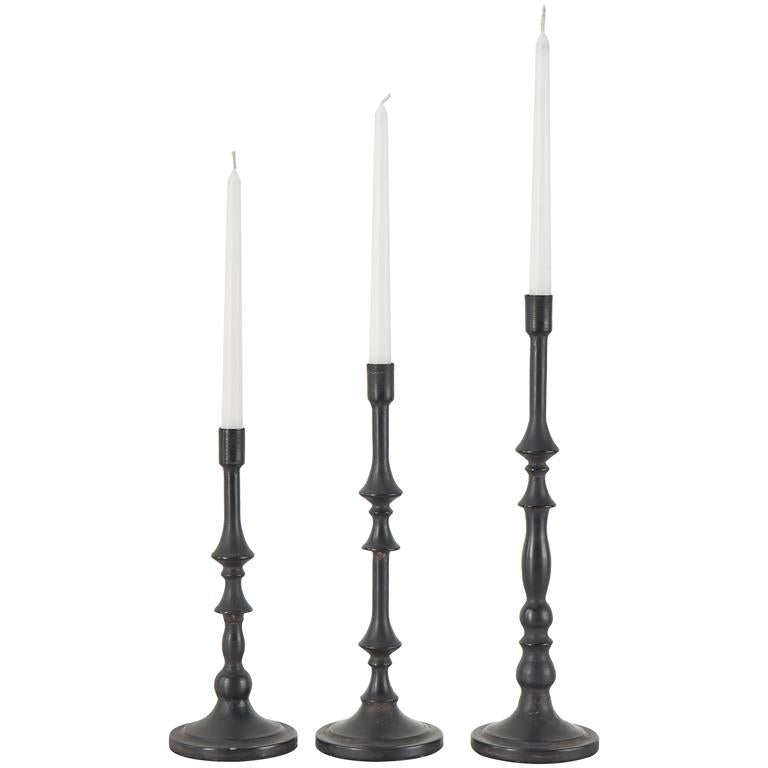 Refresh your décor with the sophisticated Black Metal Candleholders, Set of 3. Crafted from iron, each candleholder is sleek and finished with a classic, satin black look. Add a refined and timeless feel to your space with this sleek set.