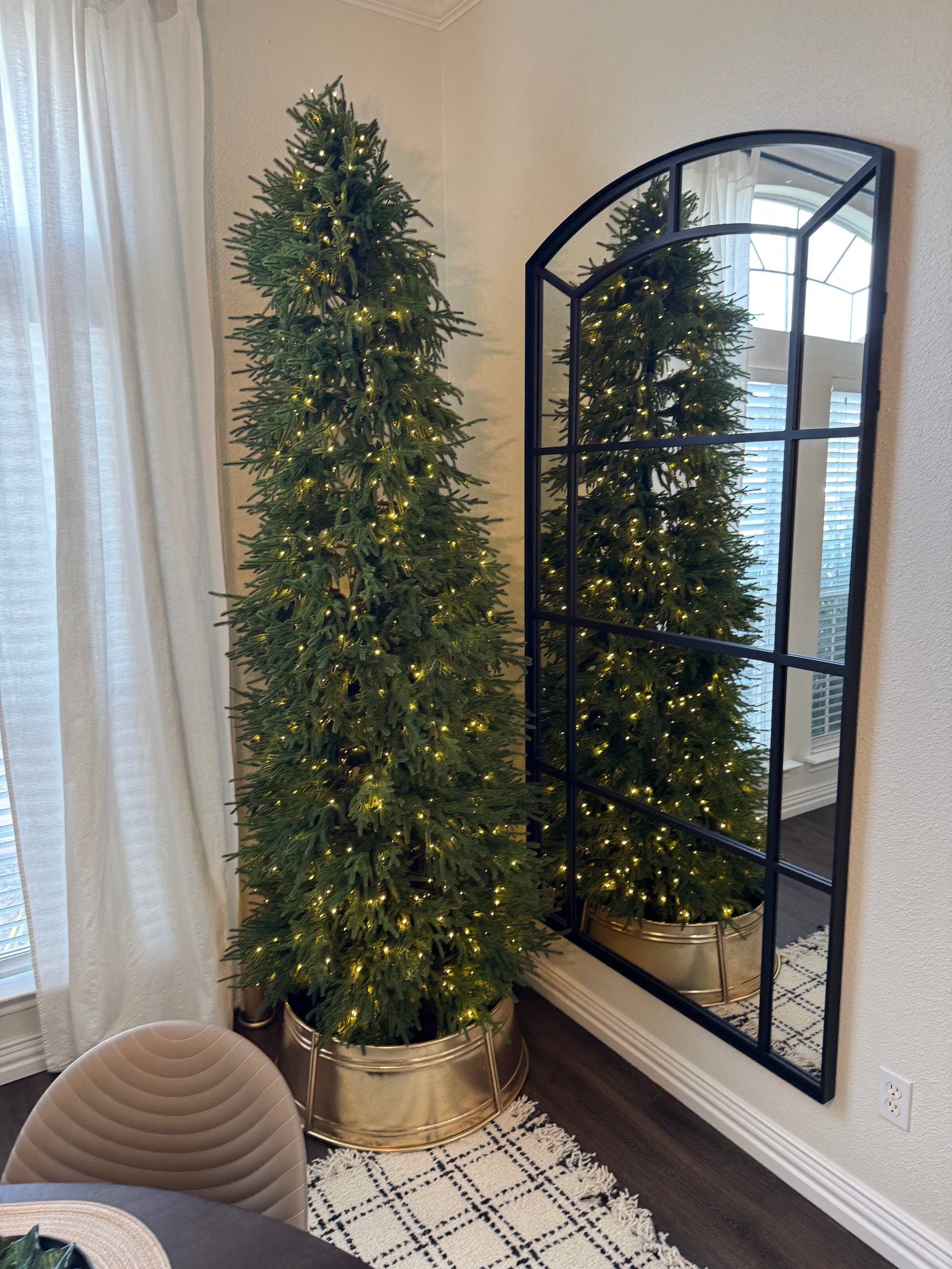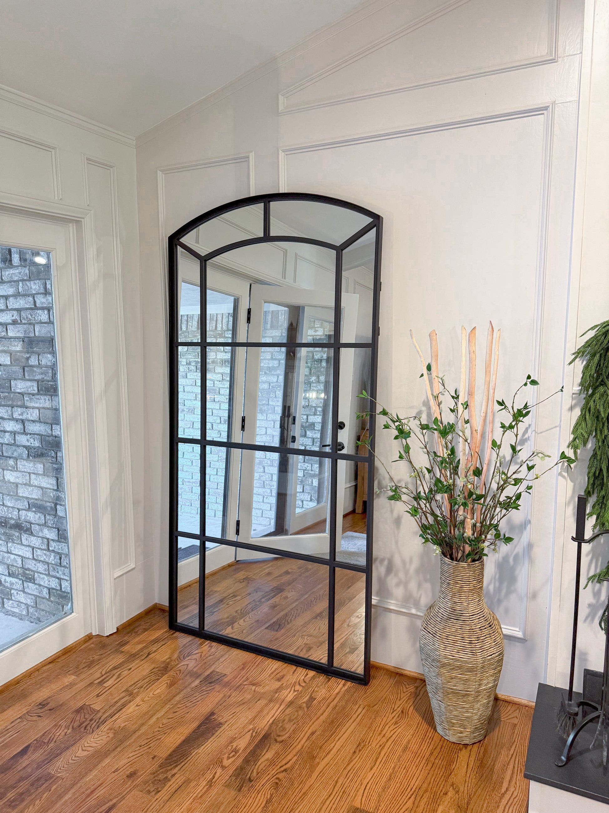 This oversized arch mirror features a substantial solid iron frame finished in a rich satin black, with a deep channeled outer edge.