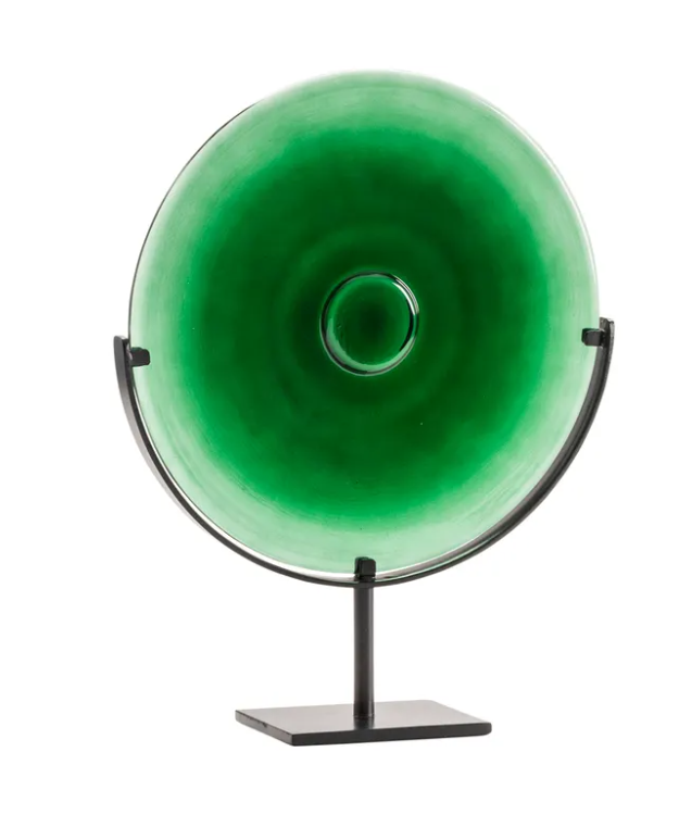 Our Miramar Short Emerald Blown Glass Disc with Stand has rich green, emerald color and ripples as though a pebble was dropped into the glass and gradually gets lighter on the outside of the disc. The sculpture comes with a black adjustable stand that will allow a variety of positions for different uses and occasions. Imagine this piece in a window or where it is backlit to add additional depth to its beauty. This disc and stand measures a total of 15-inches tall and will add allure and color to your transitional home decor.