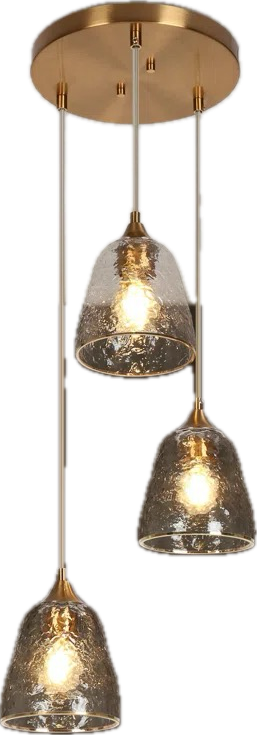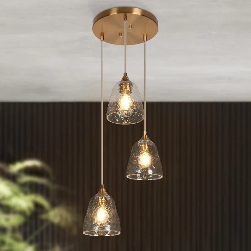 Brighten your contemporary living space with this modern and glam three-light cluster kitchen lighting pendant. Crafted from metal, a copper-gold finish covers the circle canopy and hardware. Three height-adjustable cords that each hold a water-grained glass bell lampshade. Clear glass shades add a precise aesthetic for inspired Modern luxury decor. The size of 8'' H X 13.5'' W X 13.5'' D is perfect for dining room, over a bed, kitchen, corridor, stairs, or down a hallway for a dramatic lighting statement.