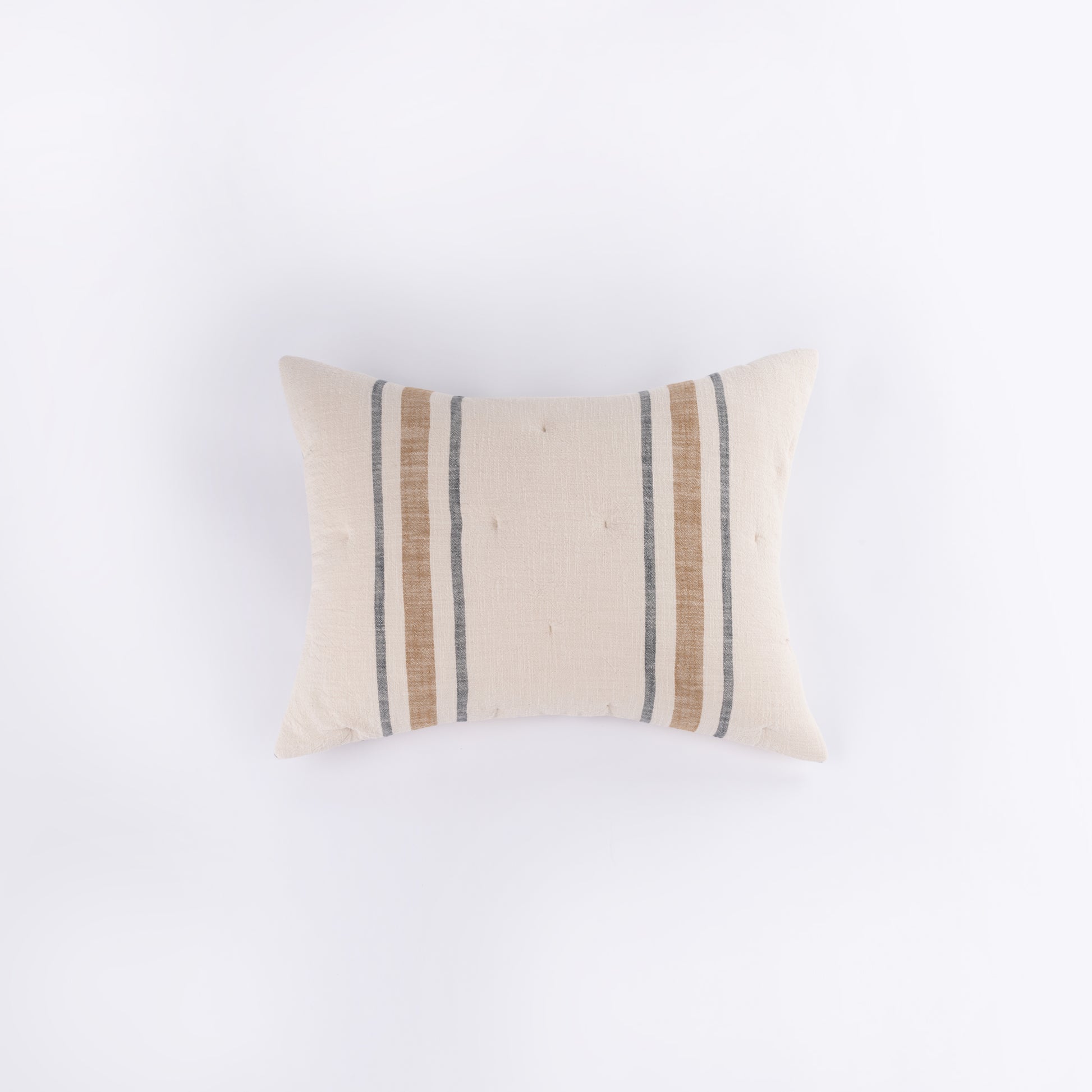 This yarn-dyed stripe pairs two sophisticated colors in a classic mirrored stripe. Constructed of a plush cotton yarn with slubs in the warp and weft, this fabric has ample texture with a soft hand. The lofty fill is tacked in a rhythmic pattern in the ivory spaces to add texture to the overall design. Shams have a hidden zipper closure and are quilted on both sides.