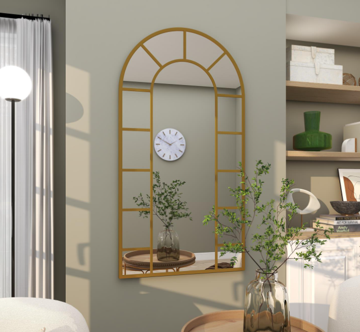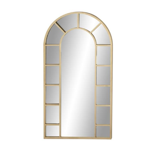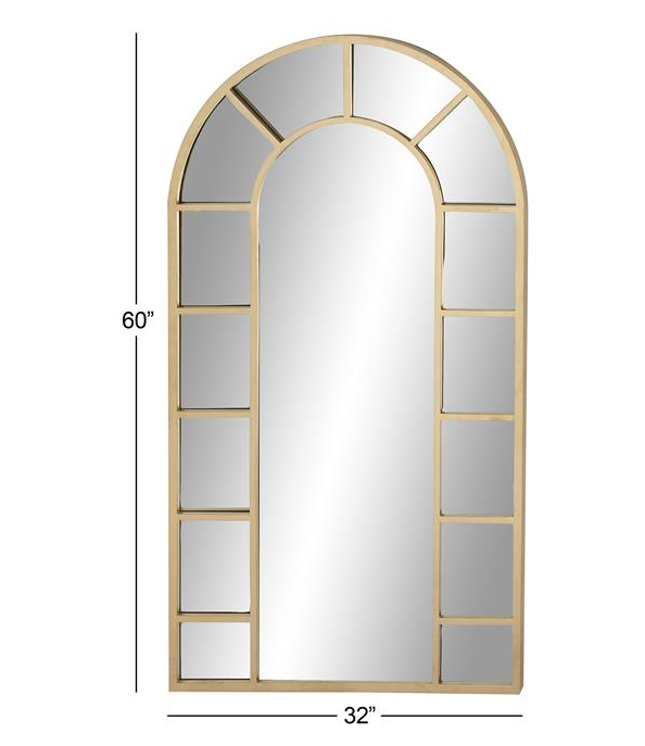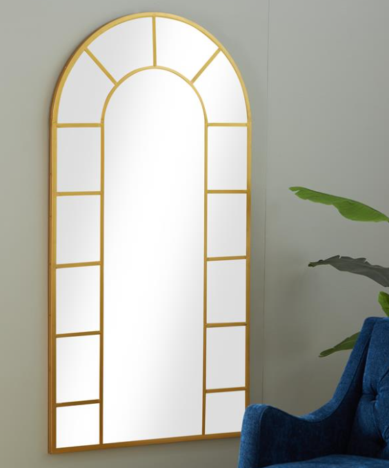 Elevate any wall with the elegant Gold Metal Arched Mirror. Its satin windowpane finish and 15 reflective surfaces create a timeless style with a durable iron frame. Maintenance is a breeze, just wipe with a dry cloth.