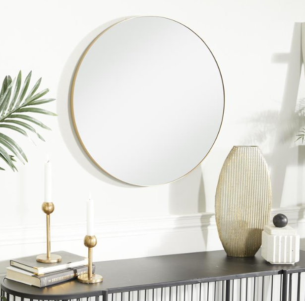 The wall mirror measures 23.75L x 1W x 23.75H inches, and weighs 9.23 lbs