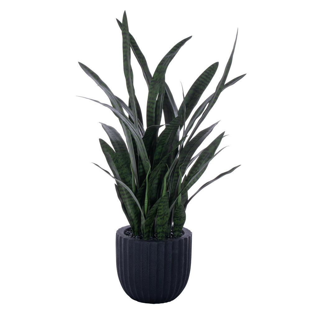This 47-inch artificial green sanseveria plant, featuring lifelike real-touch leaves, adds a touch of vibrant elegance to any room, effortlessly bringing the beauty of nature indoors with its tall, sculptural presence in a black nestable pot. It is UV resistant, making it perfect for both indoor and covered outdoor settings, ensuring long-lasting color and durability.