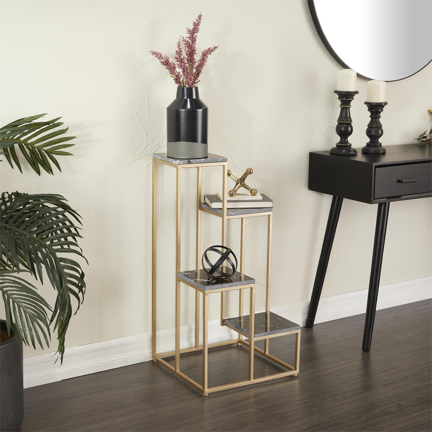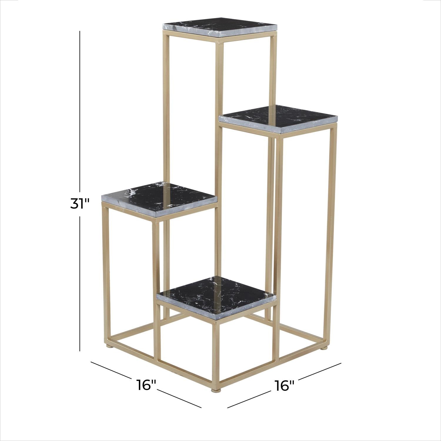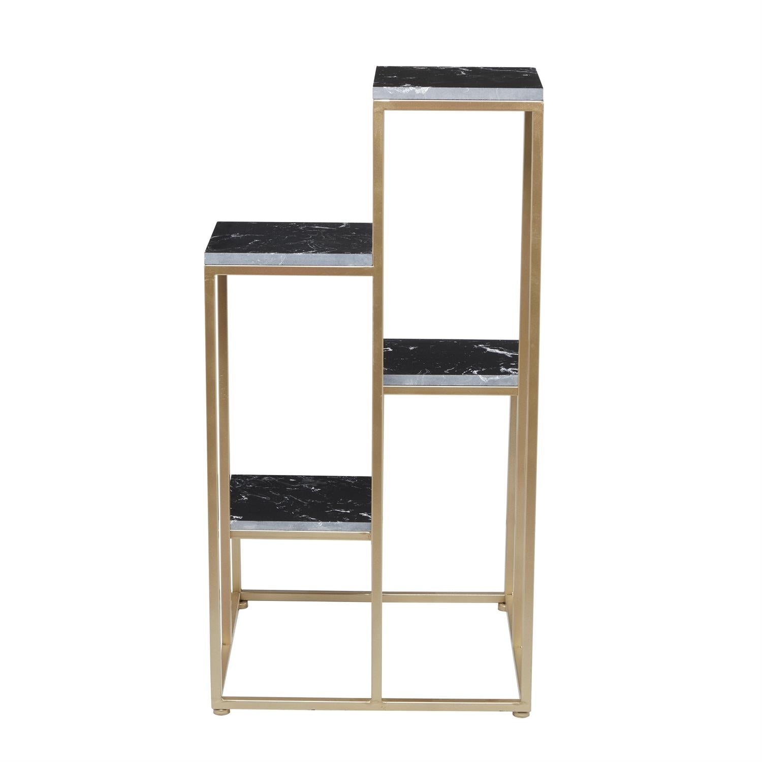 The Nova 4-Tier Plantstand is constructed from iron and marble, finished in sophisticated black and gold tones to suit glamorous interiors. This elegant piece features square marble platforms set on gold rectangular open frames arranged at varying heights, creating a stylish and functional display.