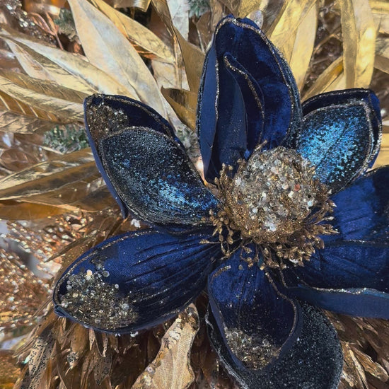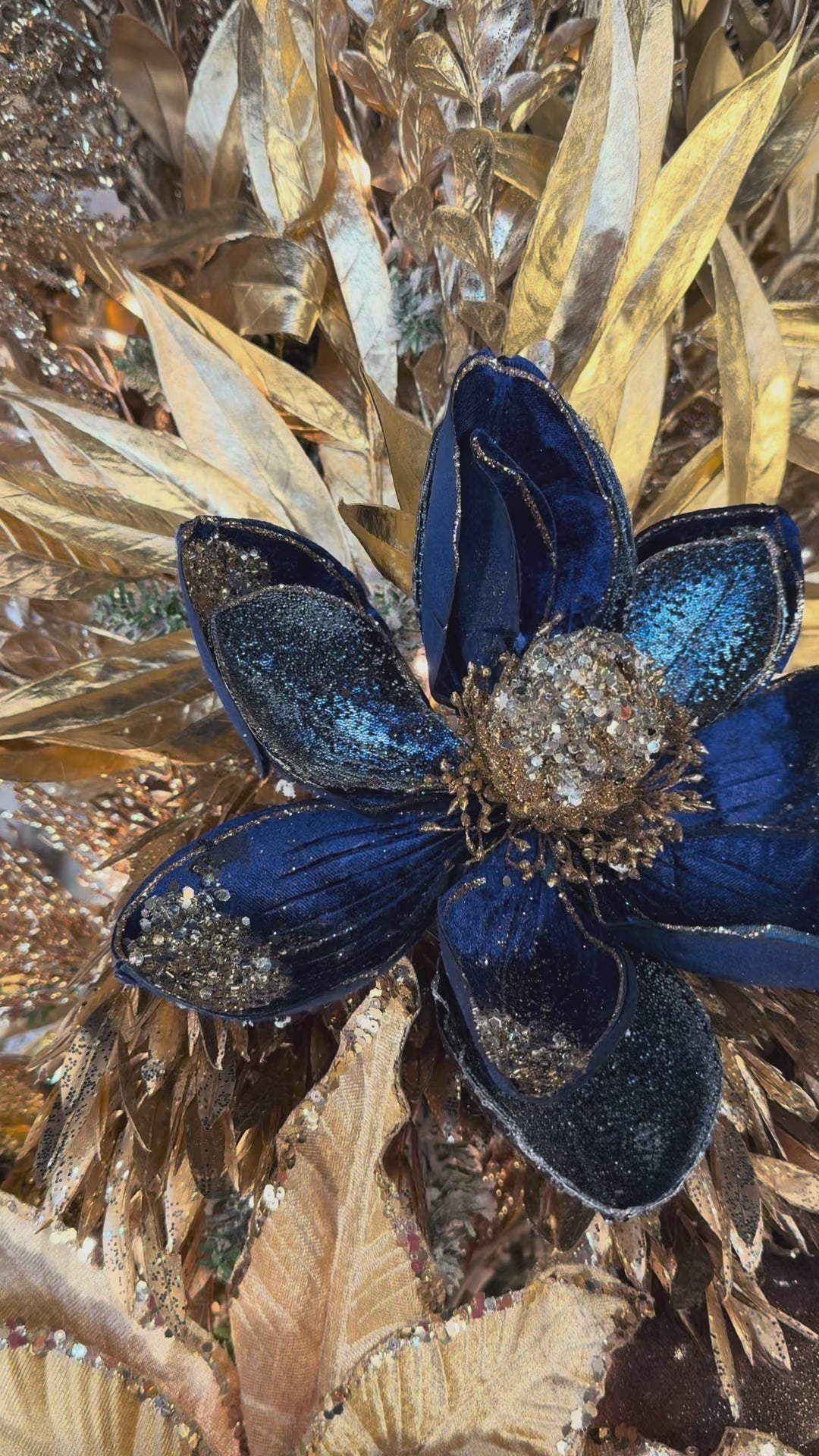 Enhance your holiday floral arrangements with the exquisite 18" Sapphire Blue & Rose Gold Magnolia Stem. The stunning combination of sapphire blue and rose gold adds a touch of elegance to any space. Whether adorning a tree or serving as a focal point in your seasonal decor, this lifelike stem is sure to captivate.