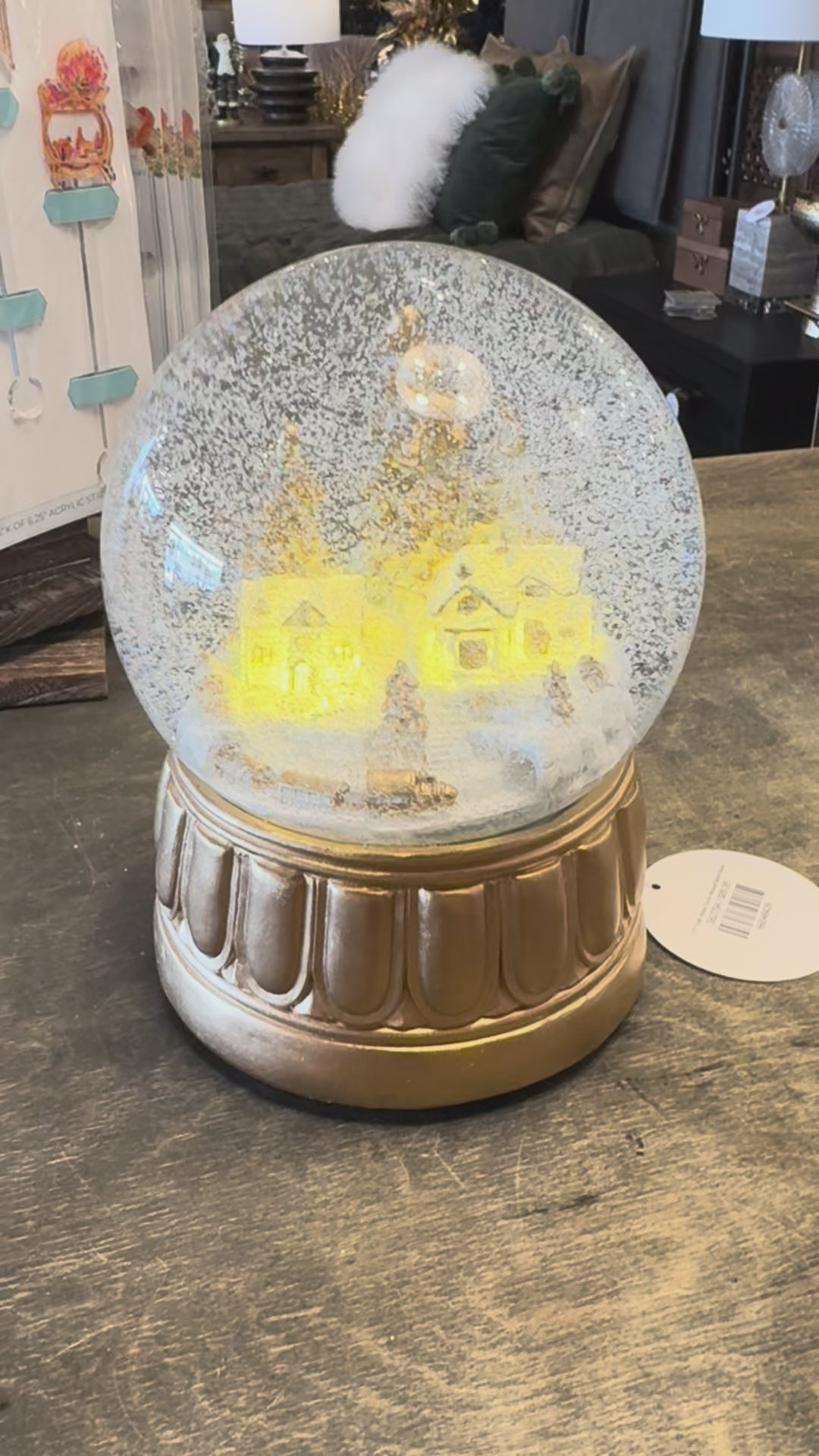 Capture the magic of winter with this elegant 7.75" Gold Winter Scene Musical Snow Globe. Featuring a delicate cream and gold color palette, it perfectly highlights a charming winter scene inside. When wound, the globe plays a soothing melody, creating a serene ambiance in any room. Its compact size makes it an ideal decorative piece for mantels, shelves, or holiday displays, bringing warmth and festive cheer throughout the season.