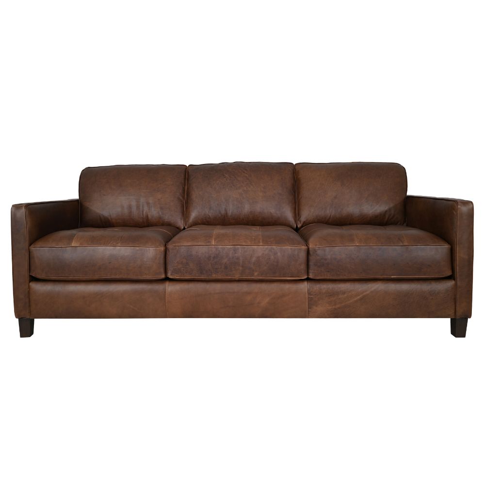 Introducing the new Renaldo Sofa in Waco Tobacco Espresso. This Italian leather sofa features three seat cushions and stands on dark brown wooden legs. Designed for comfort and durability, it’s both luxurious and simple to maintain. Made in America.