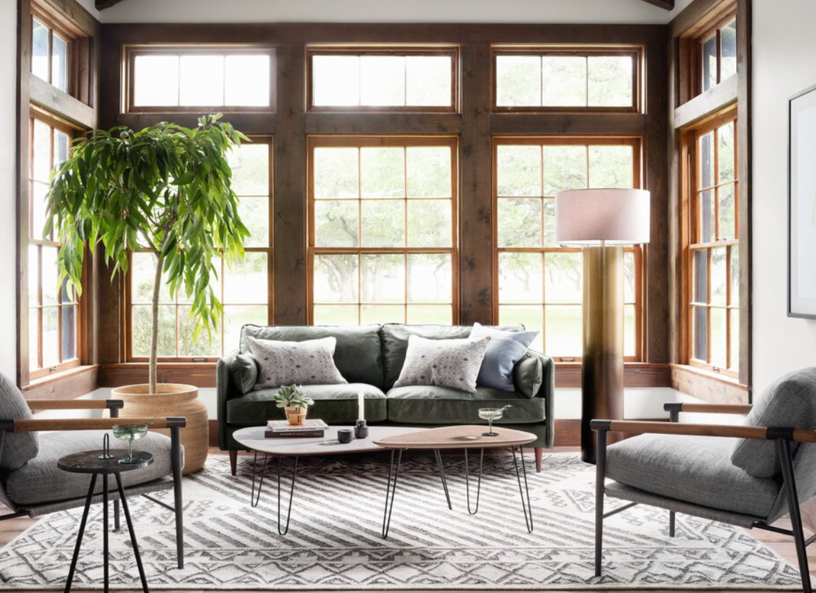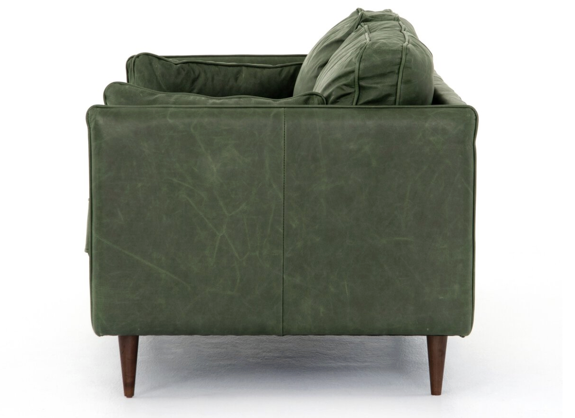 Effortlessly on-trend. Two-cushion seating of sage top-grain leather, with knife-edge pillows and welted track arms. Almond-finished legs taper for a modern touch atop mid-century influence.