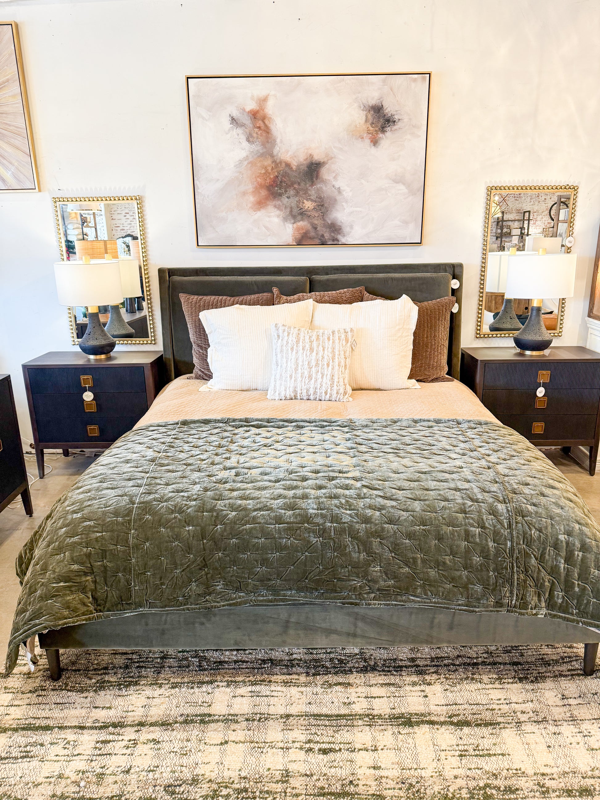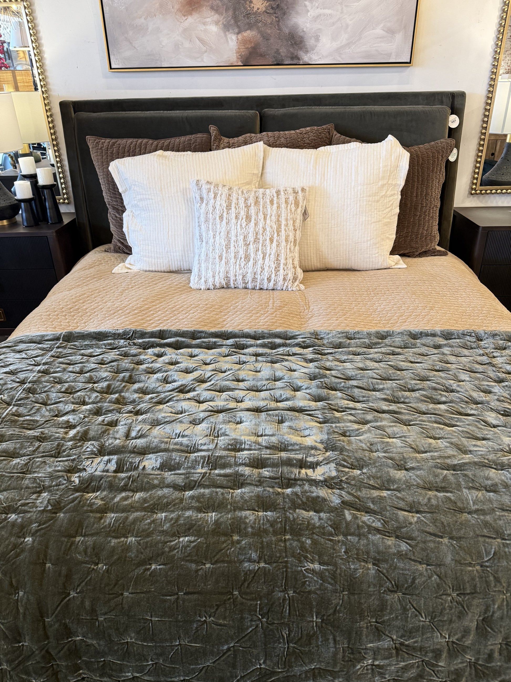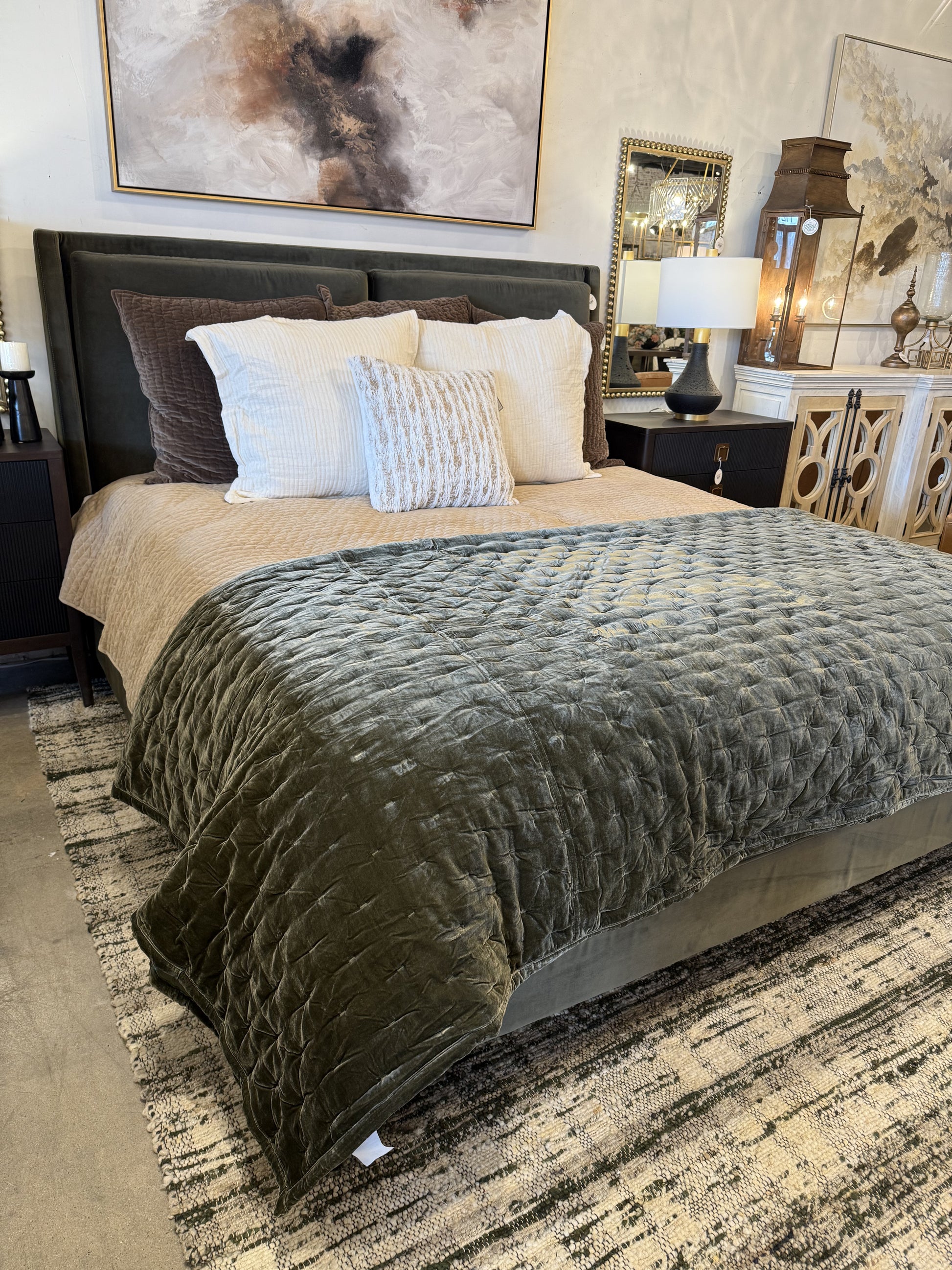 Upholstered in a velvety olive with subtle highs and lows that change in appearance depending on the direction of the fabric's nap. Fixed headboard cushioning for adds texture and comfort, while tapered oak legs lend a low-profile look.