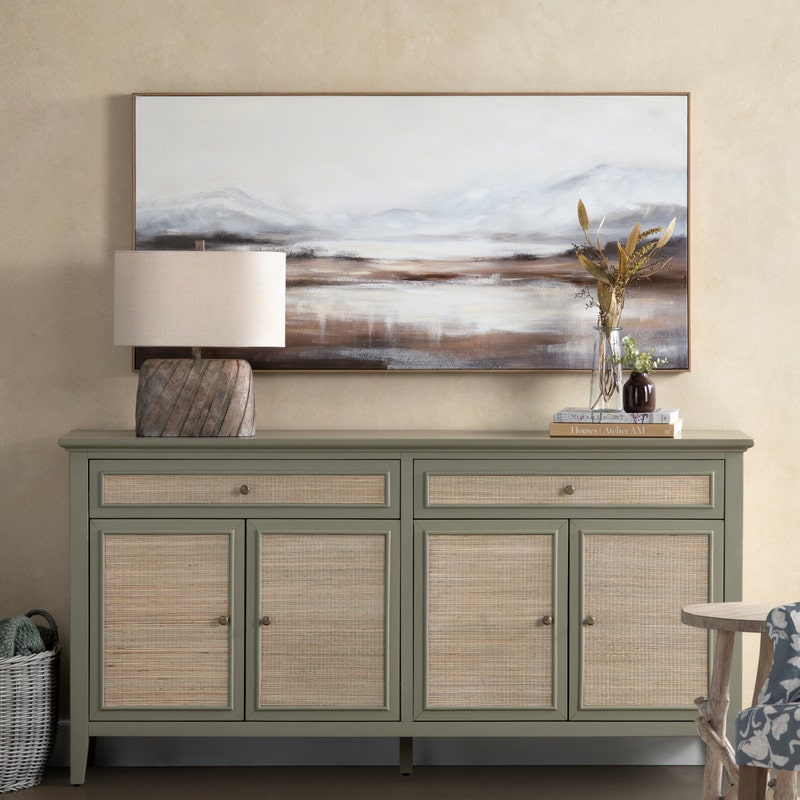 The "Albuquerque" canvas painting showcases a cloud-covered, mountainous landscape scene. The muted brown and grey tones evoke a sense of calm, providing a breathtaking backdrop to the lush grassy plain in the foreground. The wooden frame's rustic finish adds warmth and character, enhancing the overall aesthetic while ensuring that the artwork feels grounded and organic. Ideal for a variety of spaces, this rustic-inspired piece can enrich a living room, bedroom, or study, providing a calming influence that encourages relaxation and reflection. For proper wall display, use the two included D-ring brackets for quick and easy installation.