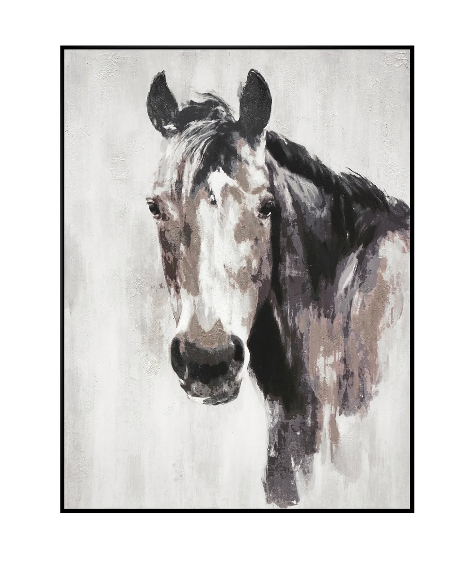 Introducing our Brantley Horse Painting on Canvas, a piece that portrays the charm of rustic design. This canvas features a warm color palette of brown, black, and white, capturing the essence of the equine world. The piece is adorned with heavy hand-painted texture, adding depth and character to the artwork. It is framed in classic black, creating a statement piece that exudes both rural charm and artistic sophistication.