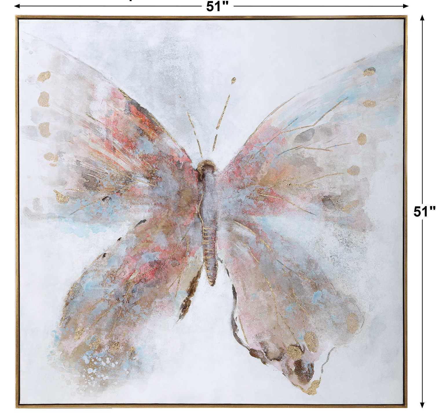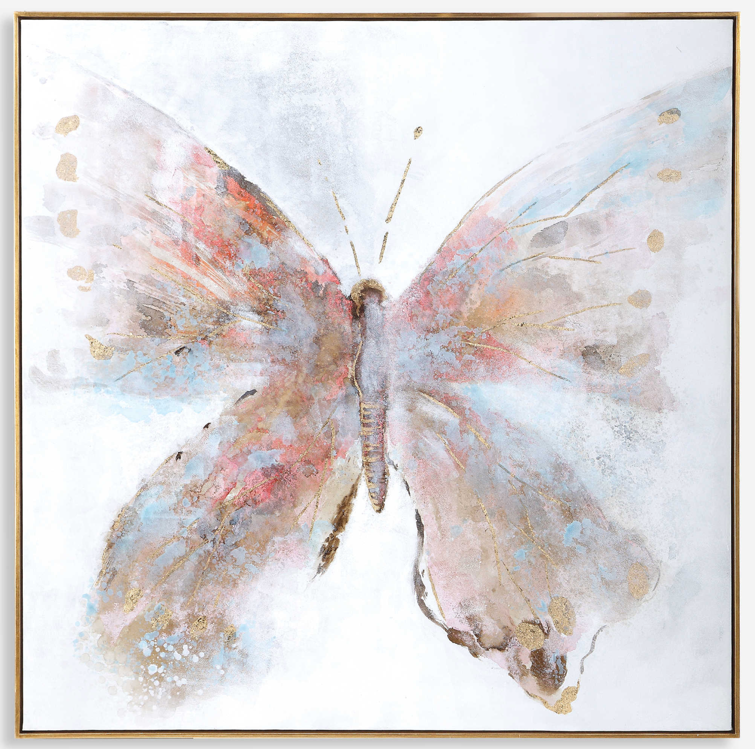 Showcasing a whimsical flair, this hand painted canvas pairs vibrant shades of fuchsia and red-orange with subdued shades of powder blue and light gray. This contemporary butterfly artwork also features hints of gold and silver leaf and is complemented by an antique gold leaf gallery frame. Due to the handcrafted nature of this artwork, each piece may have subtle differences.