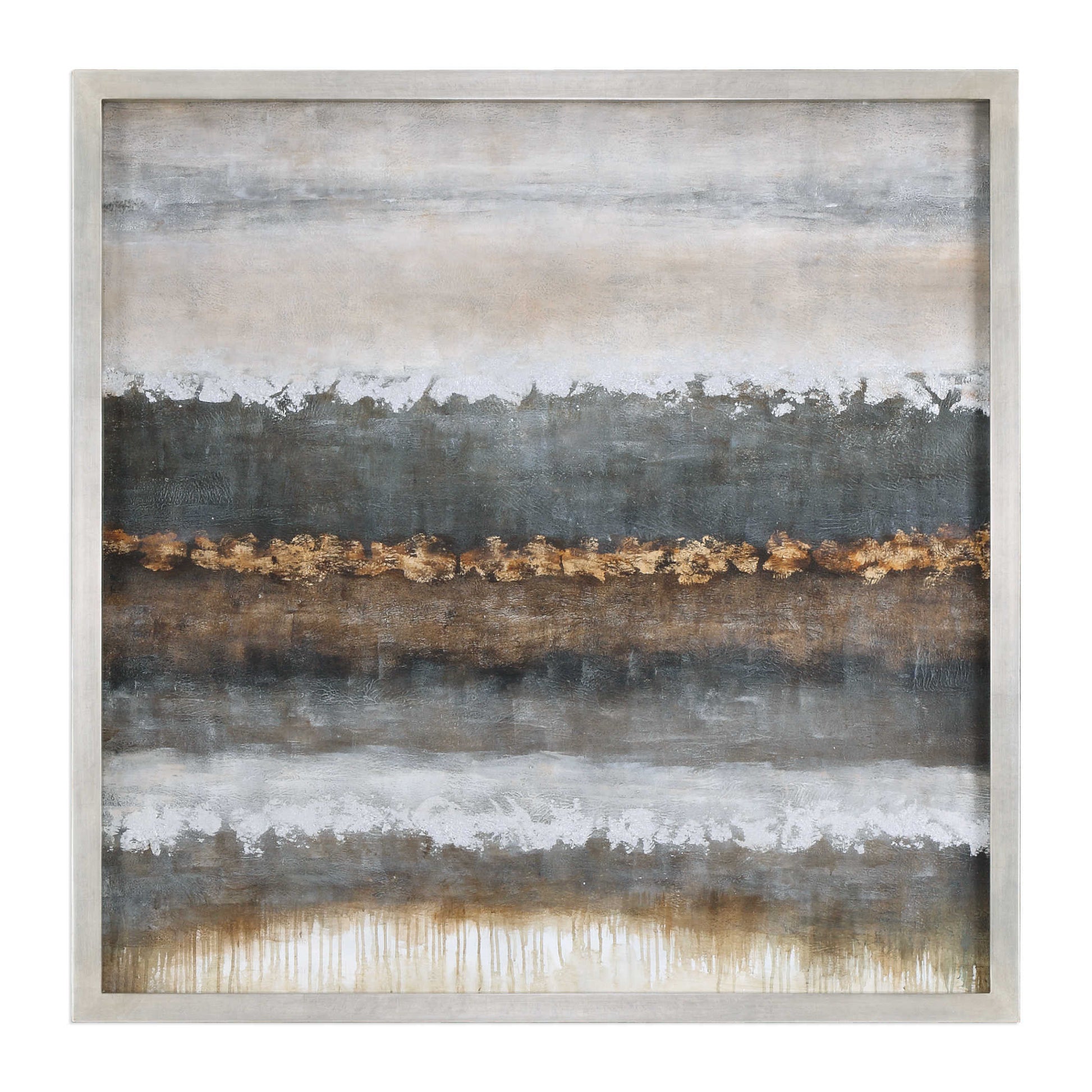 Layered metallic neutrals create a masculine and industrial feel in this hand-painted abstract on canvas. Gold leaf accents pop against a brown, charcoal, and gray background. A champagne silver frame surrounds each canvas, which has been stretched and applied to a wooden frame. Due to the handcrafted nature of this artwork, each piece may have subtle differences.
