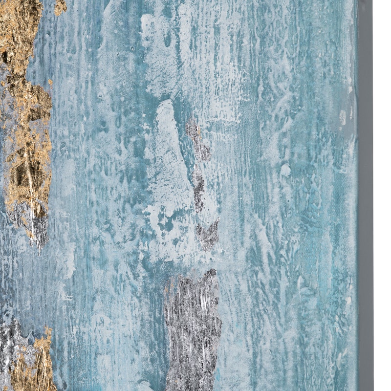 Our Lennon Oversized Hand Painted Abstract On Canvas features tones of blue, white and gold foil embellishments. This oversized canvas measures 70-inches x 96-inches, and can be hung either vertically or horizontally. Modernize your décor with this elegant abstract painting.