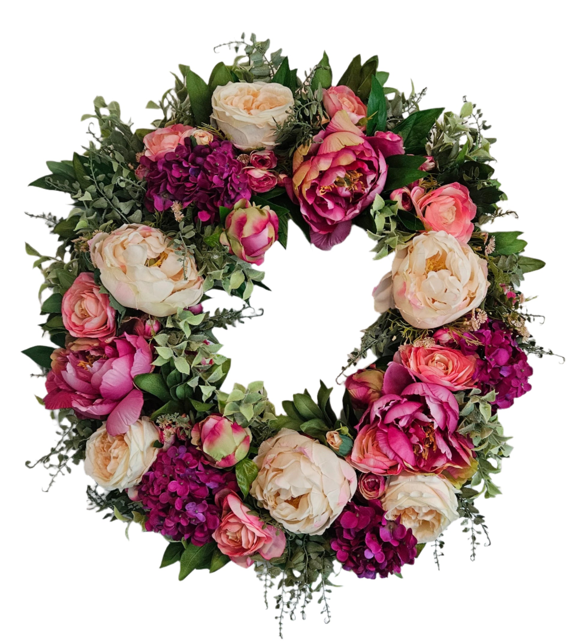 This colorful wreath is designed with silk pale yellow peonies and real touch roses.