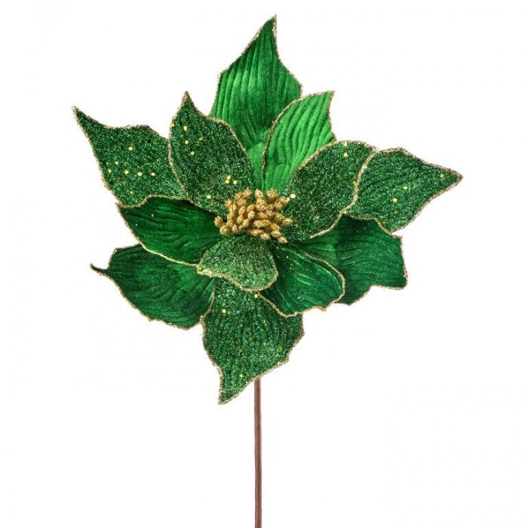 24" Velvet Glitter Beaded Poinsettia Stem, Green