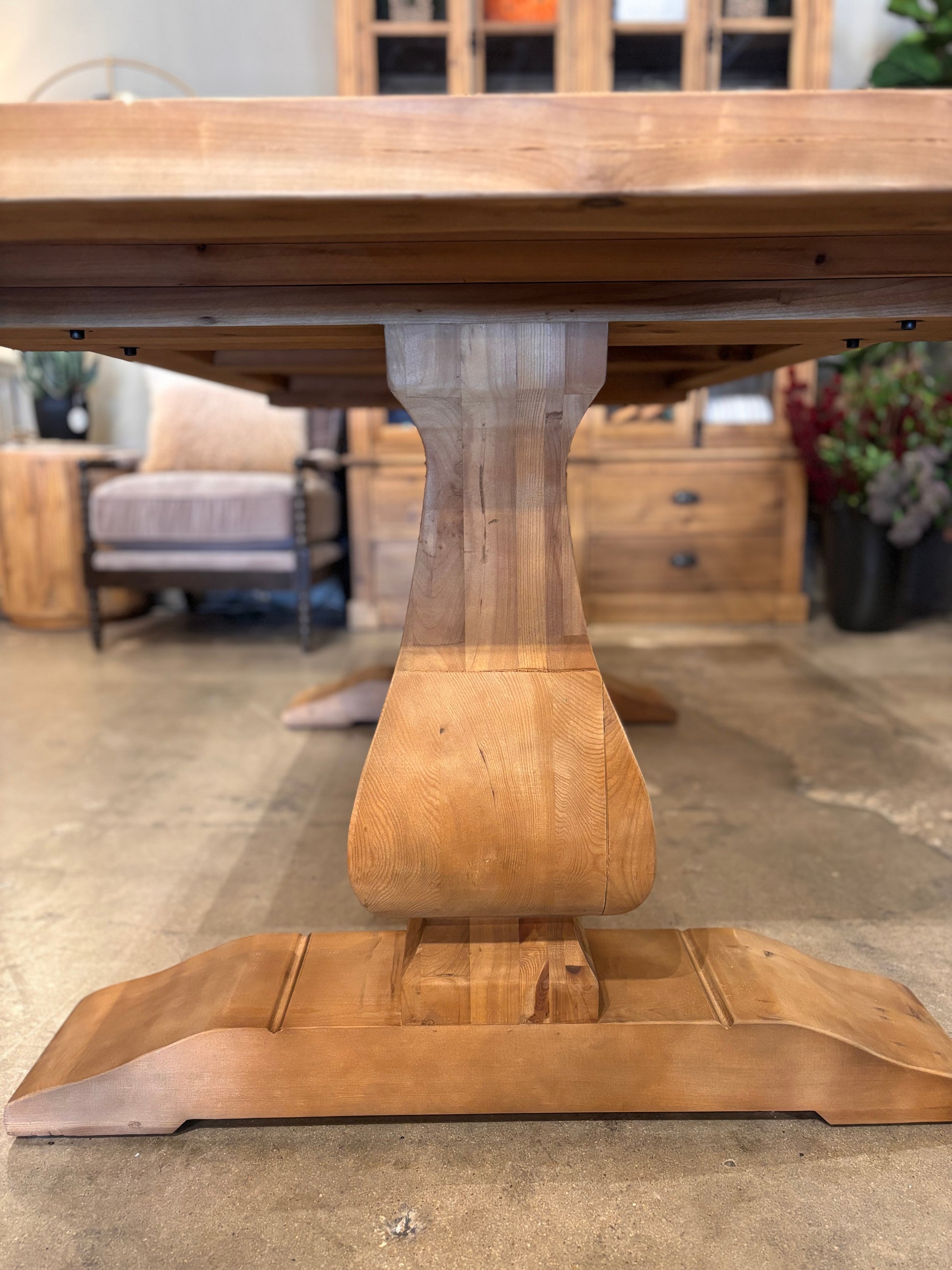 The perfect farmhouse or transitional trestle dining table. Features light natural wood finish and parquet top. Wonderful carved baluster trestle base. Easily seats 6.
