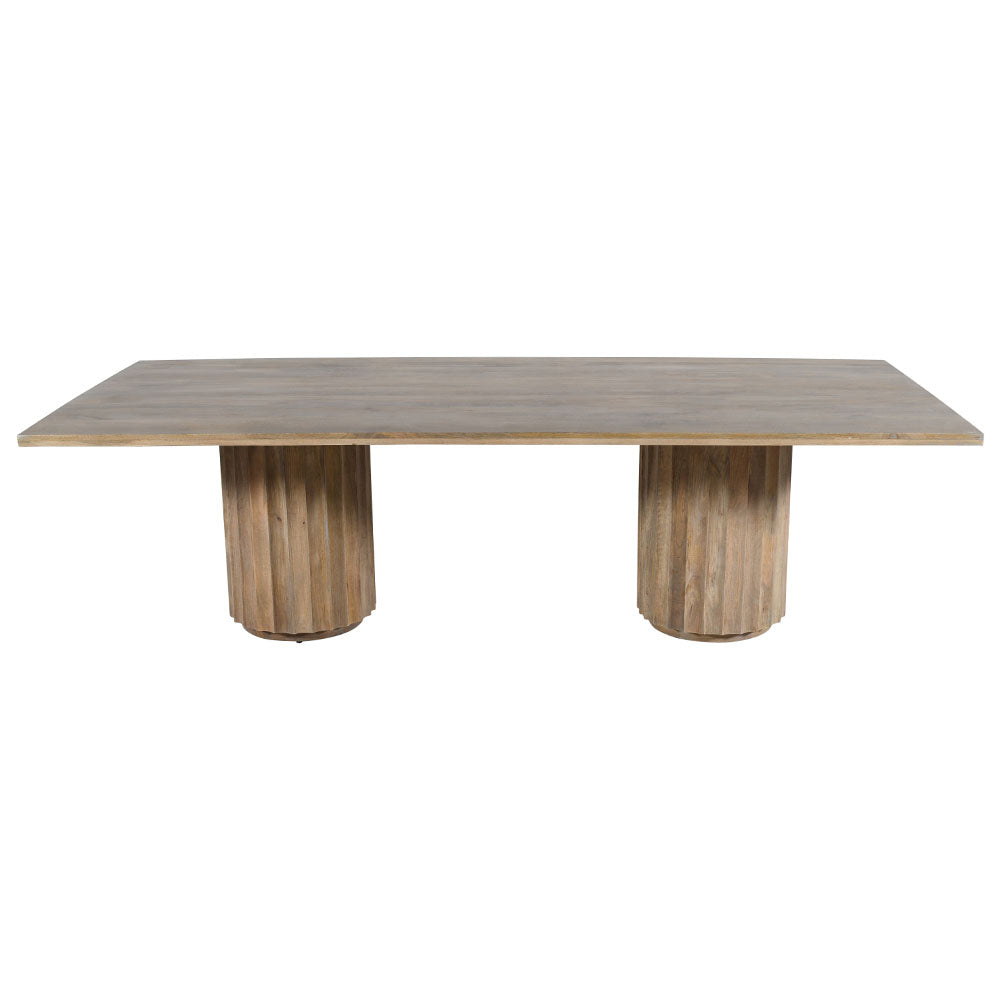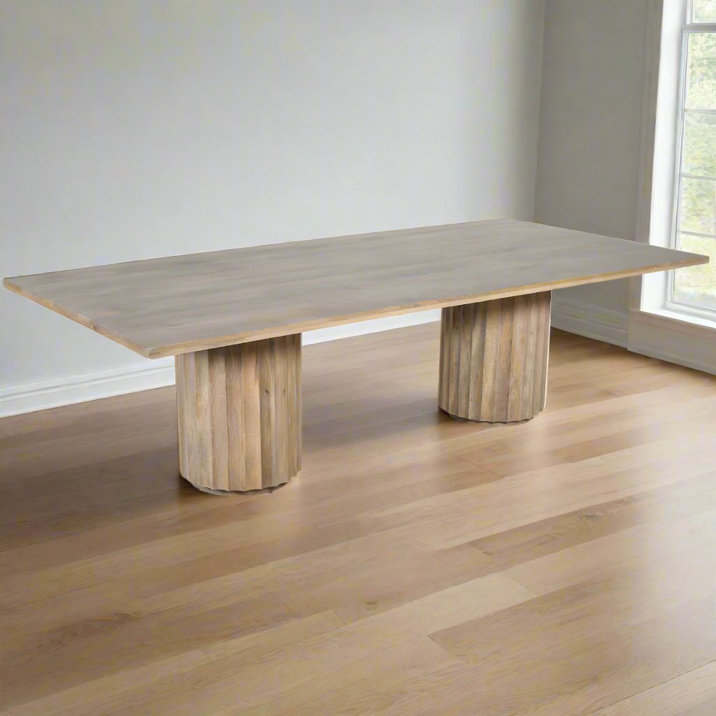 This 8.5' long rectangle dining table features a sturdy mango wood base and a beautiful top! Its generous size comfortably accommodates large gatherings of family and friends. Perfect for an elegant dining experience. Easily seats 8-10 people.