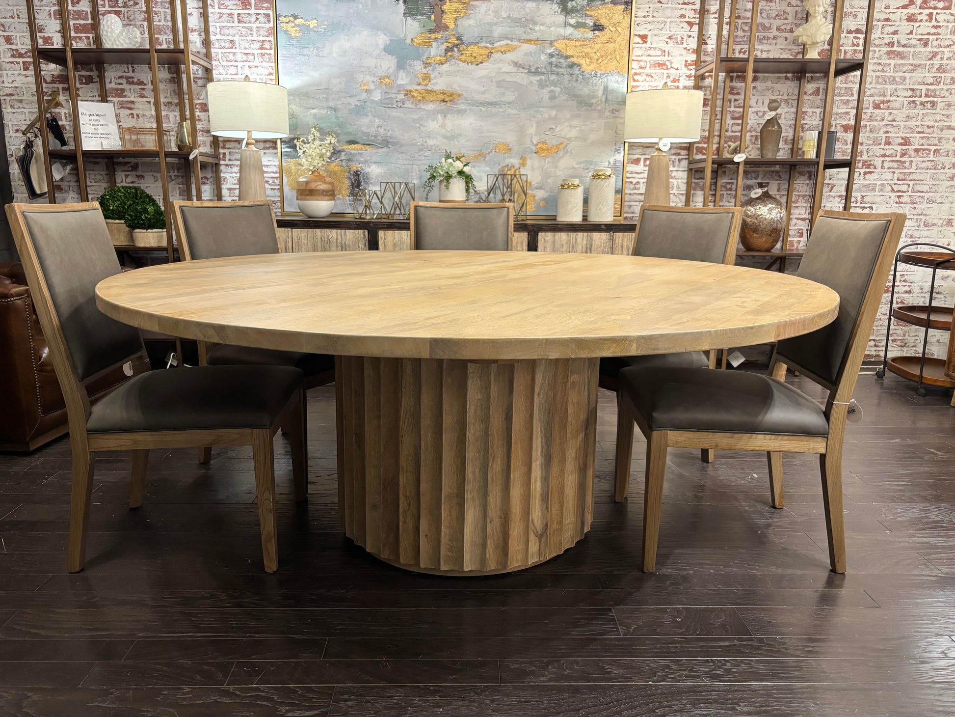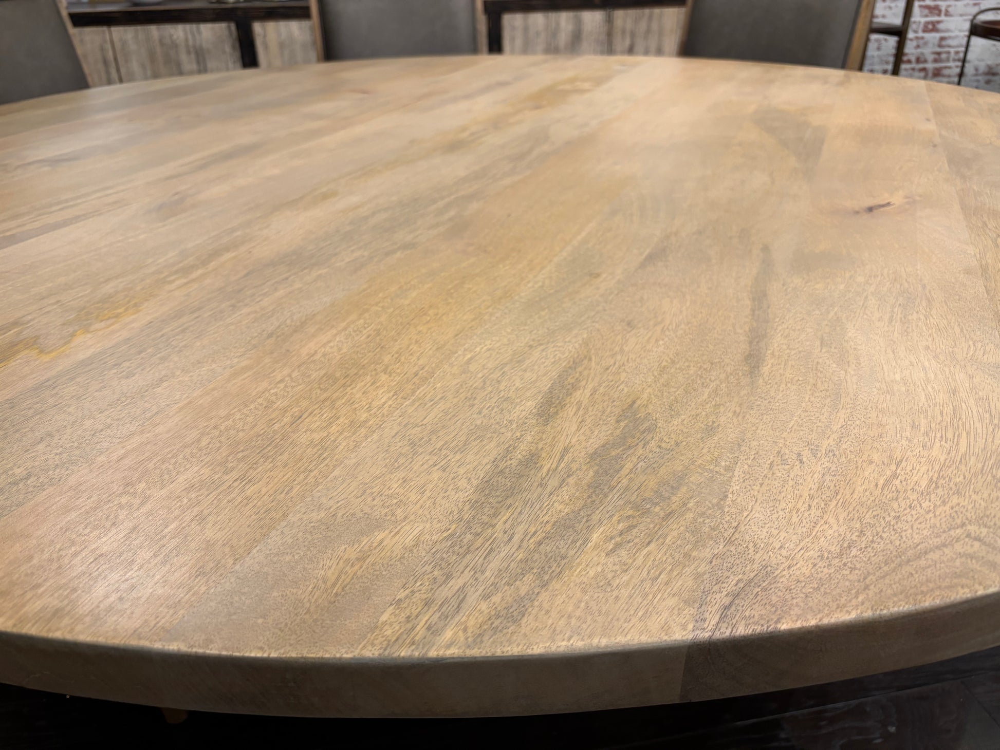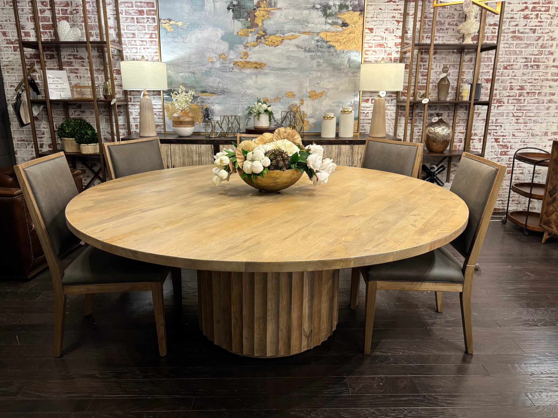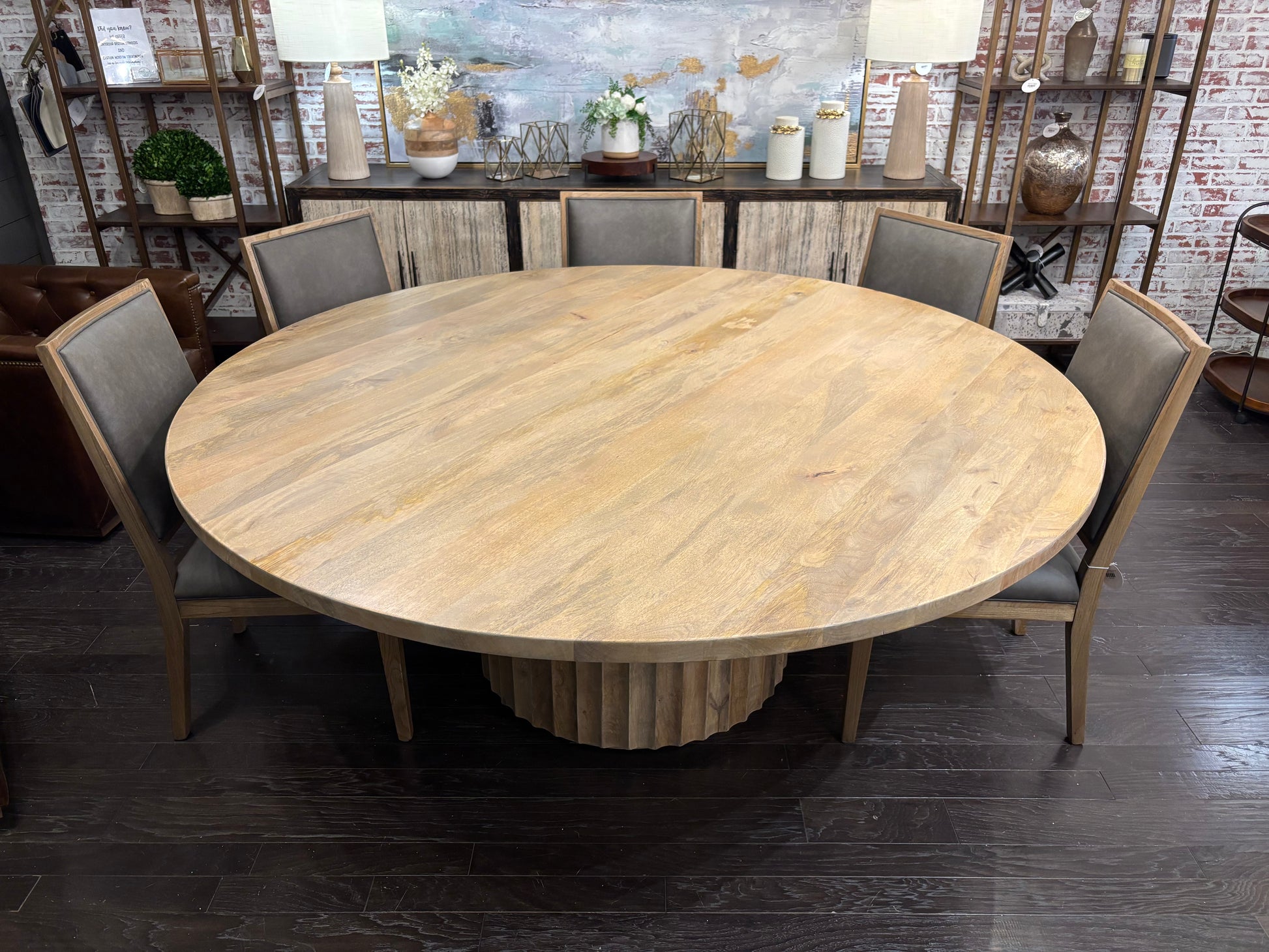 This 78" round dining table features a sturdy mango wood base and a beautiful top! Its generous size comfortably accommodates large gatherings of family and friends. Perfect for an elegant dining experience.