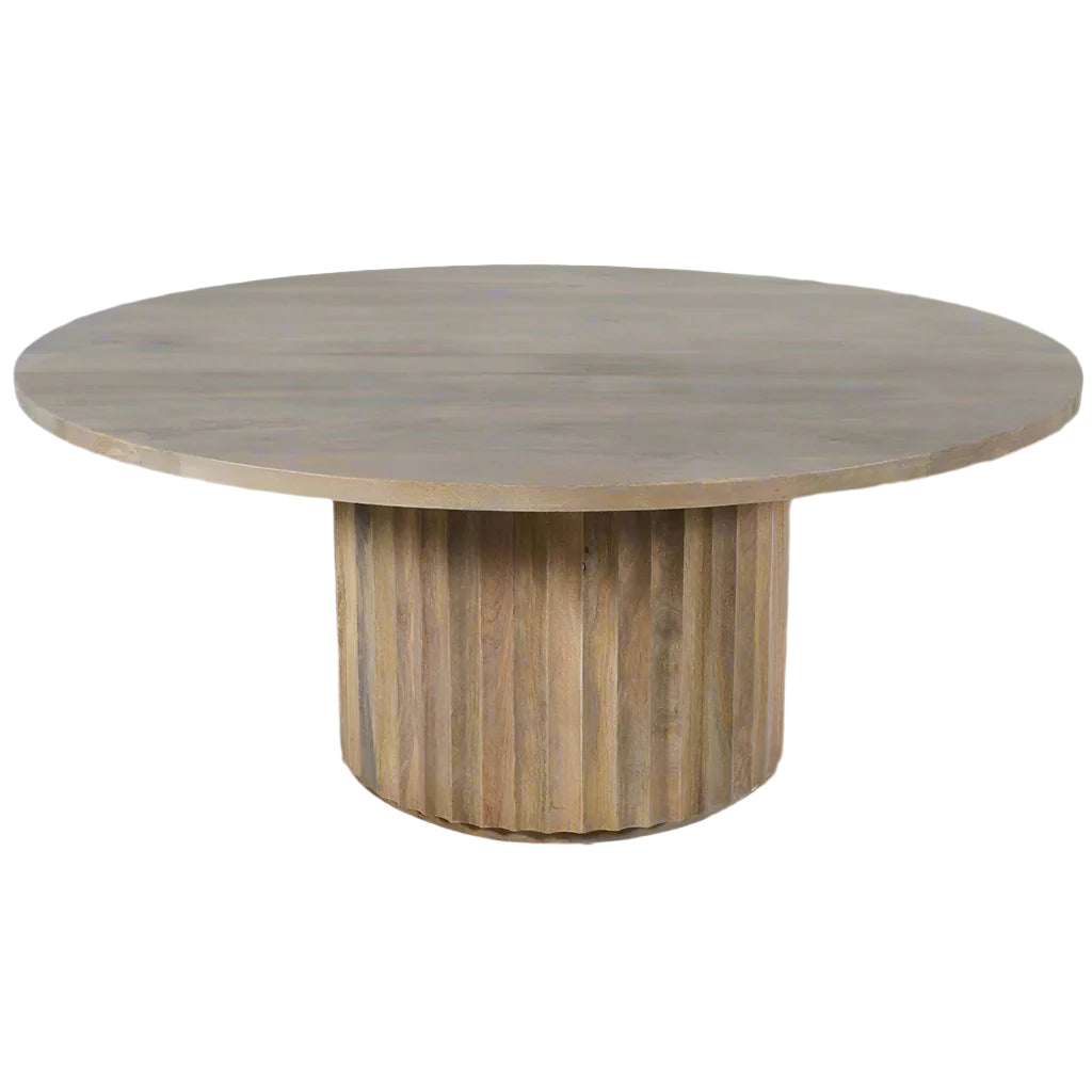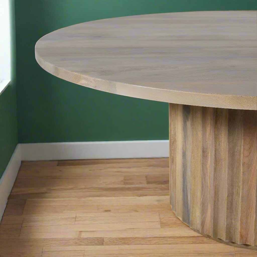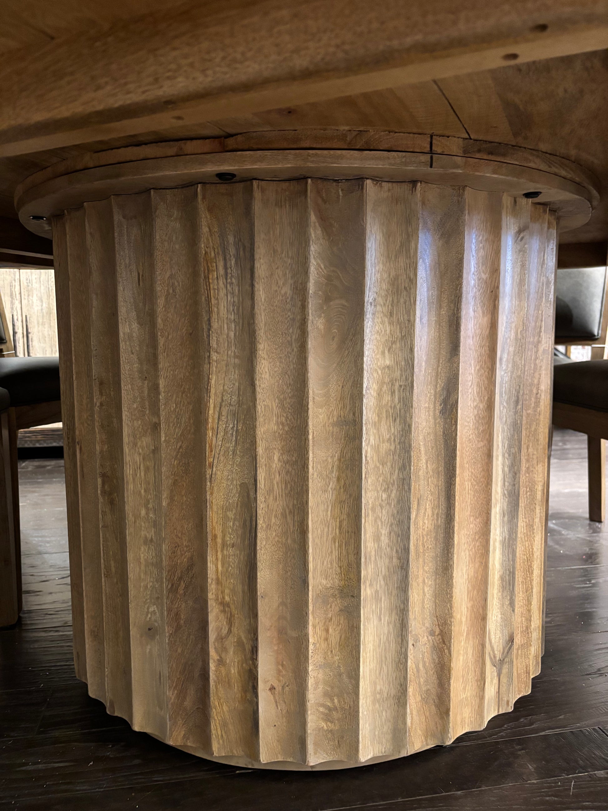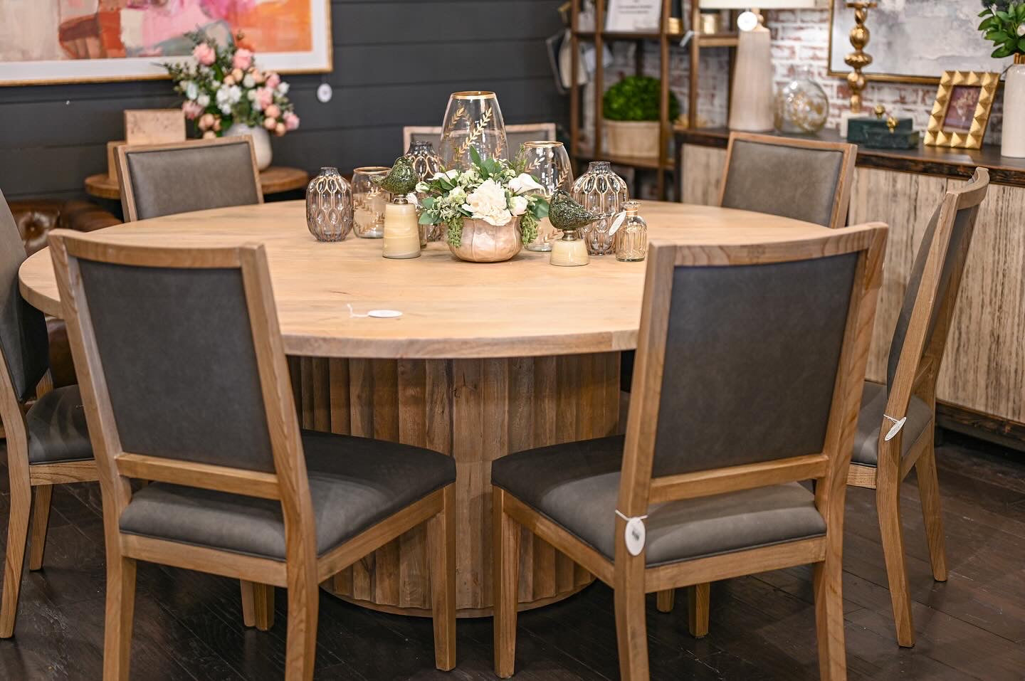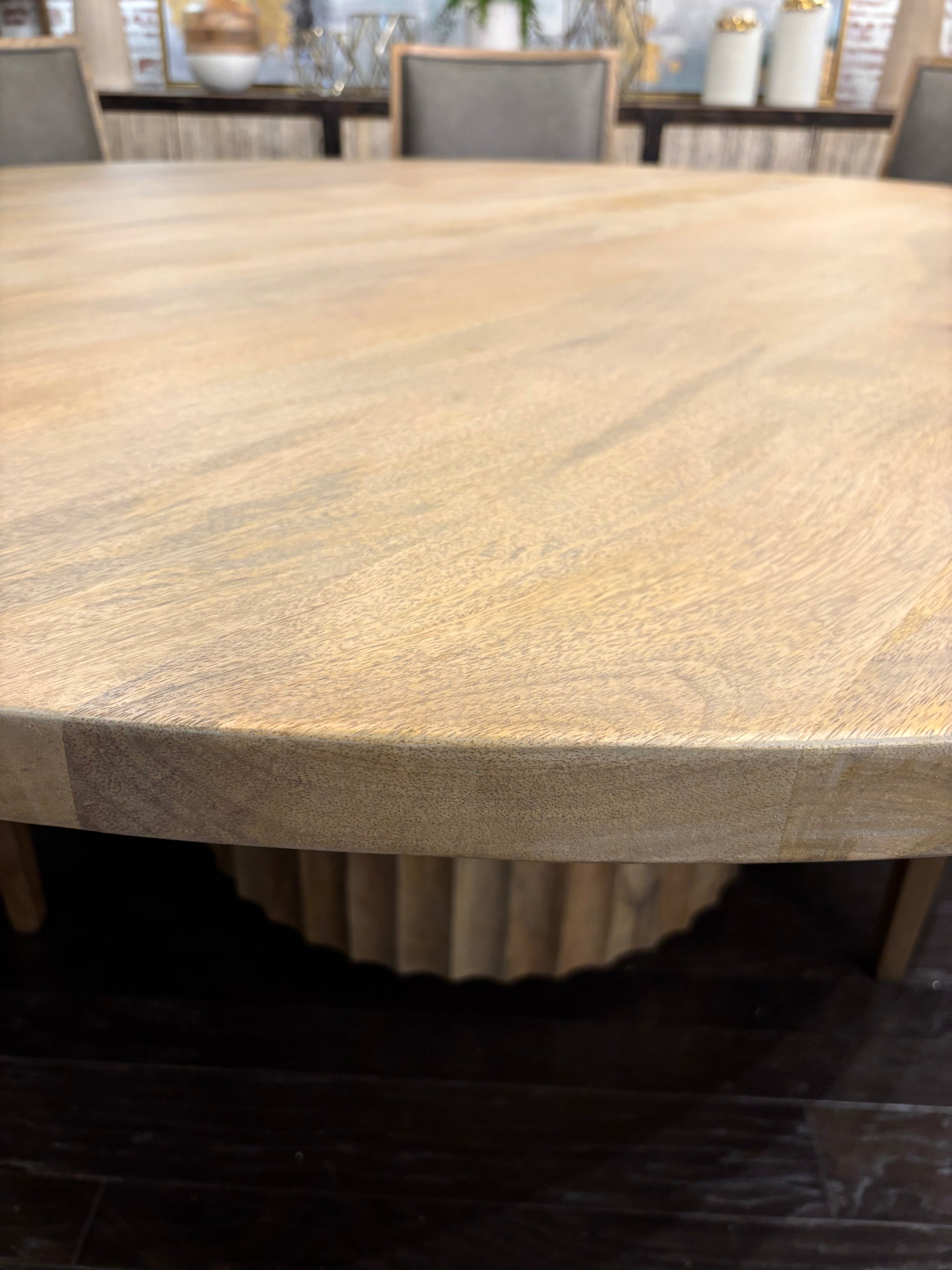 This 78" round dining table features a sturdy mango wood base and a beautiful top! Its generous size comfortably accommodates large gatherings of family and friends. Perfect for an elegant dining experience.