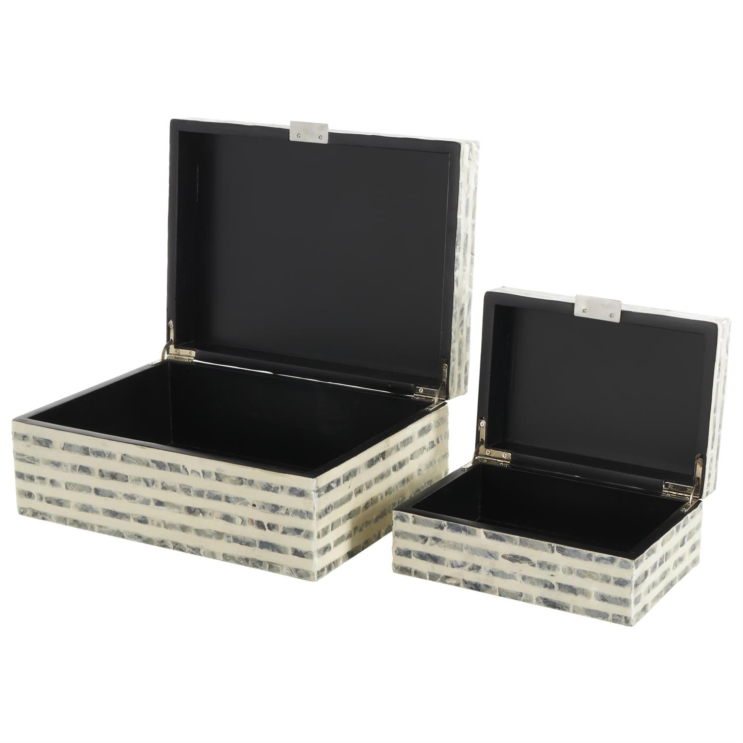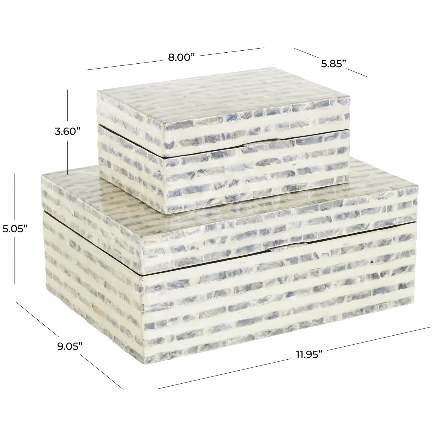 These two storage boxes display a stunning and refined mosaic made of cream and gray mother of pearl, resulting in a contemporary and visually mesmerizing look. One of the most striking qualities of these mosaic storage boxes is the intricate and distinctive design which combines the radiant charm of mother of pearl with a modern geometric pattern.