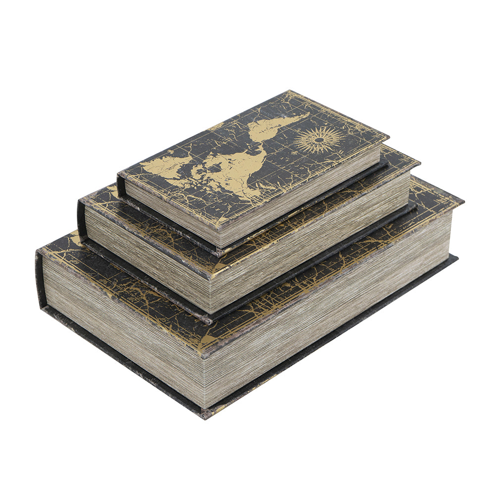 Marrying old-world beauty with versatile function, each box showcases an aged, multi-colored motif, reminiscent of weathered maps or antique tomes. Appearing as though they are simply normal books, each box can be opened to discreetly store keepsakes, trinkets, and much more, introducing a new layer to your organization.