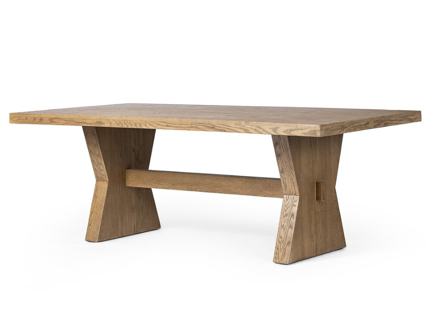 Inspired by European antiques, a clean, elongated dining surface and bowtie-shaped legs serve plenty of presence. A single stretcher adds a traditional feel to this refreshed altar table made from solid oak. This table will last for generations to come!!